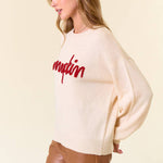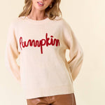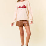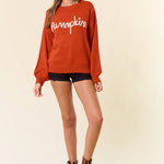 PUMPKIN Letter Embroidered Round Neck Oversized Sweater Top 100%ACRYLIC TOTAL LENGTH 25"| BUST 20 1/2"| SLEEVE LENGTH 21" MODEL IS 5'10" | BUST 34" | WAIST 24" | HIPS 35" WEARING SIZE S