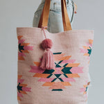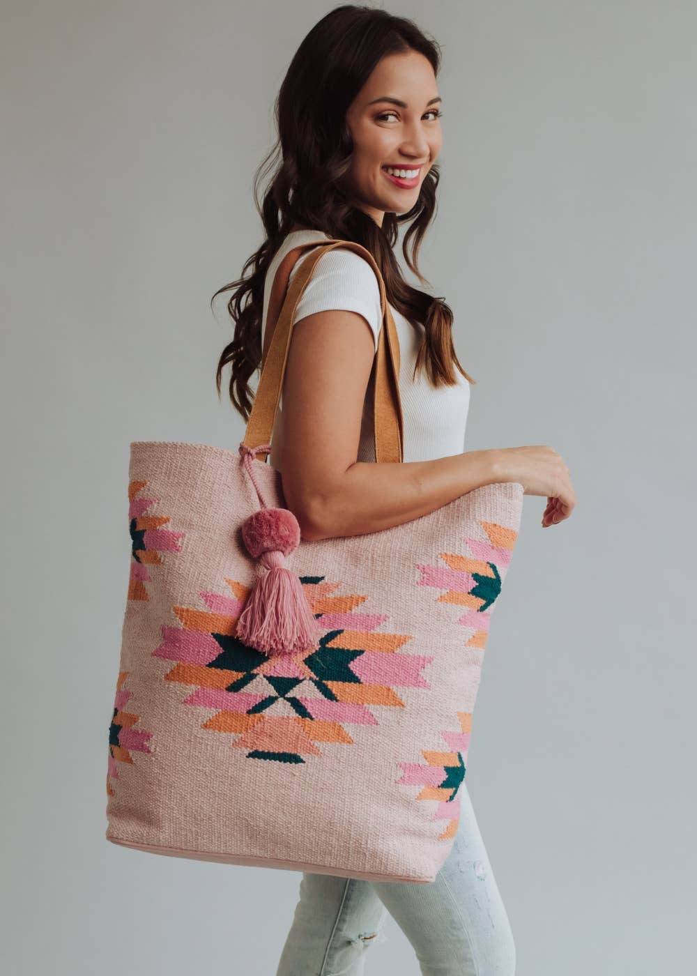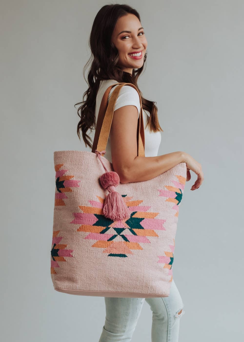 Pink, teal & orange Aztec tote Pink pom tassel 17" x 6.5" x 14.5" 100% Cotton Min. Qty. 2