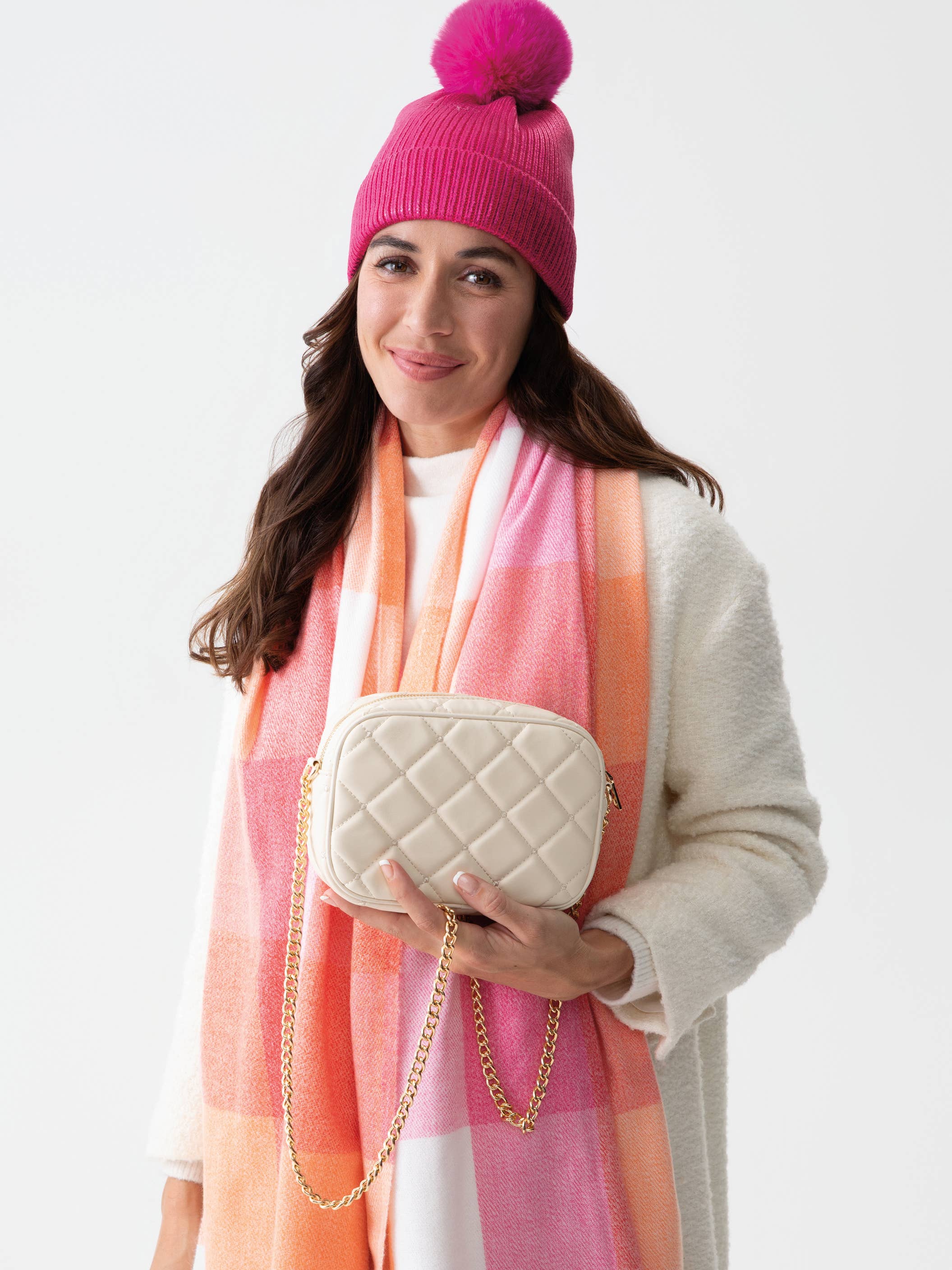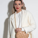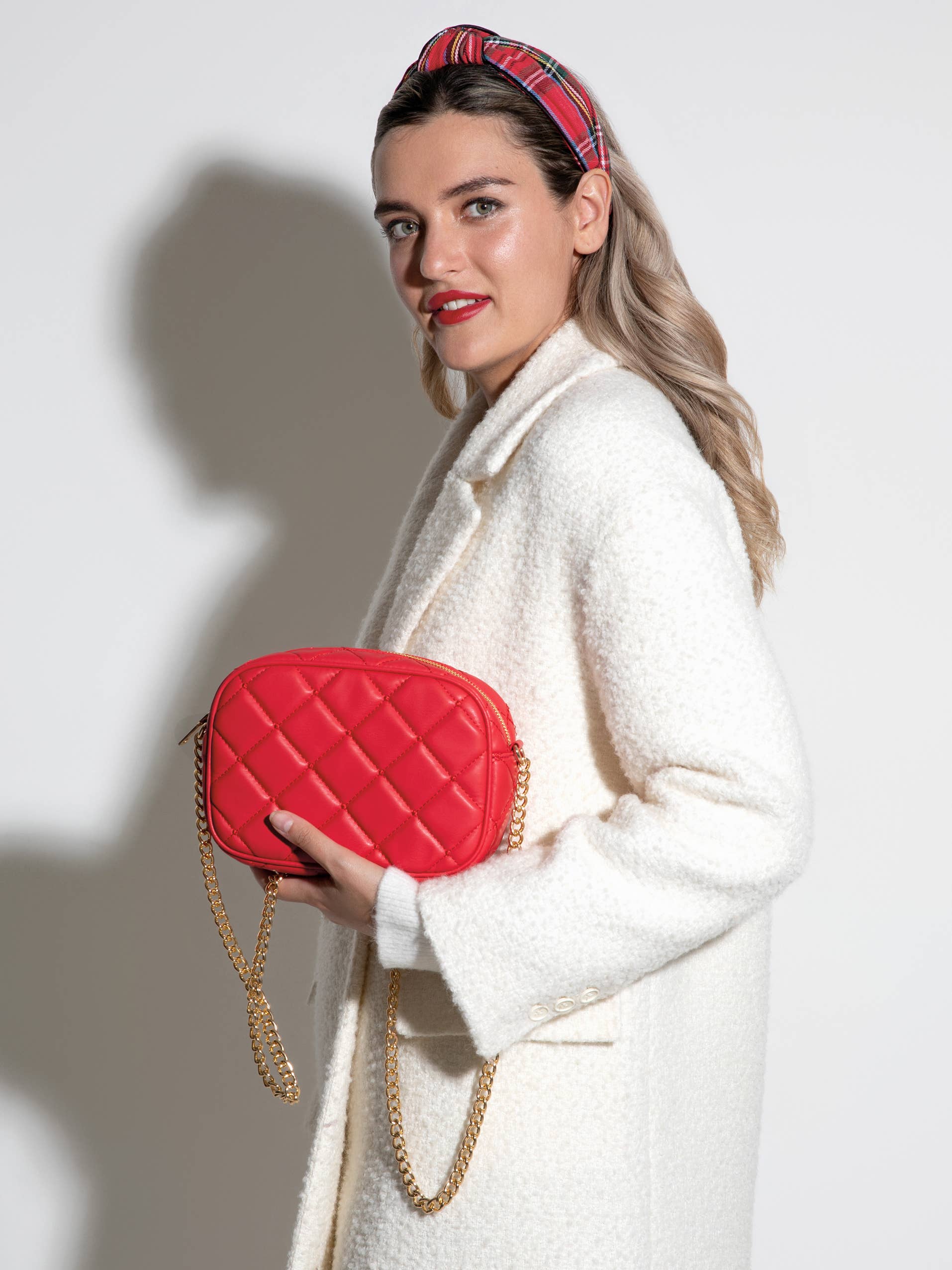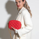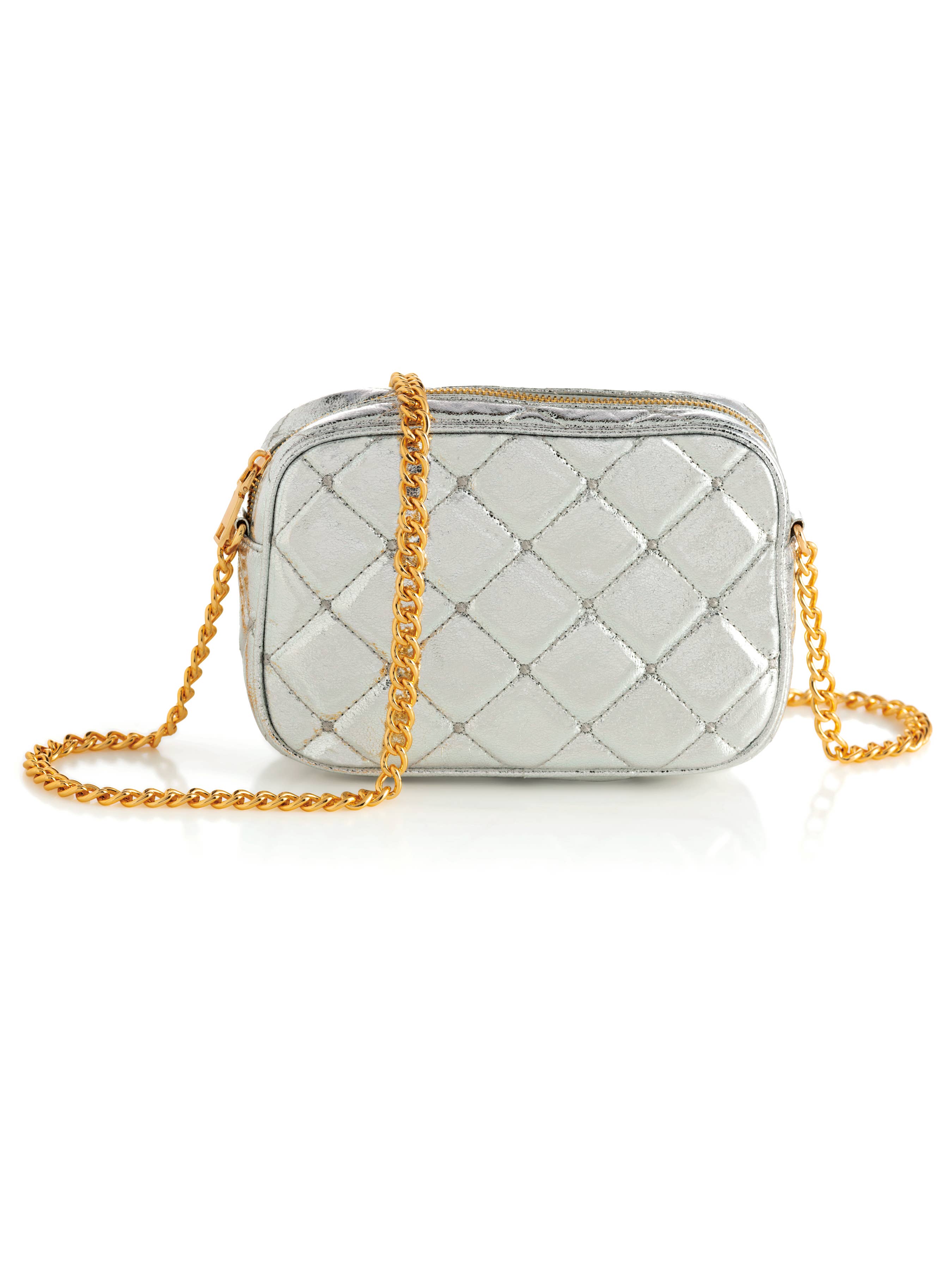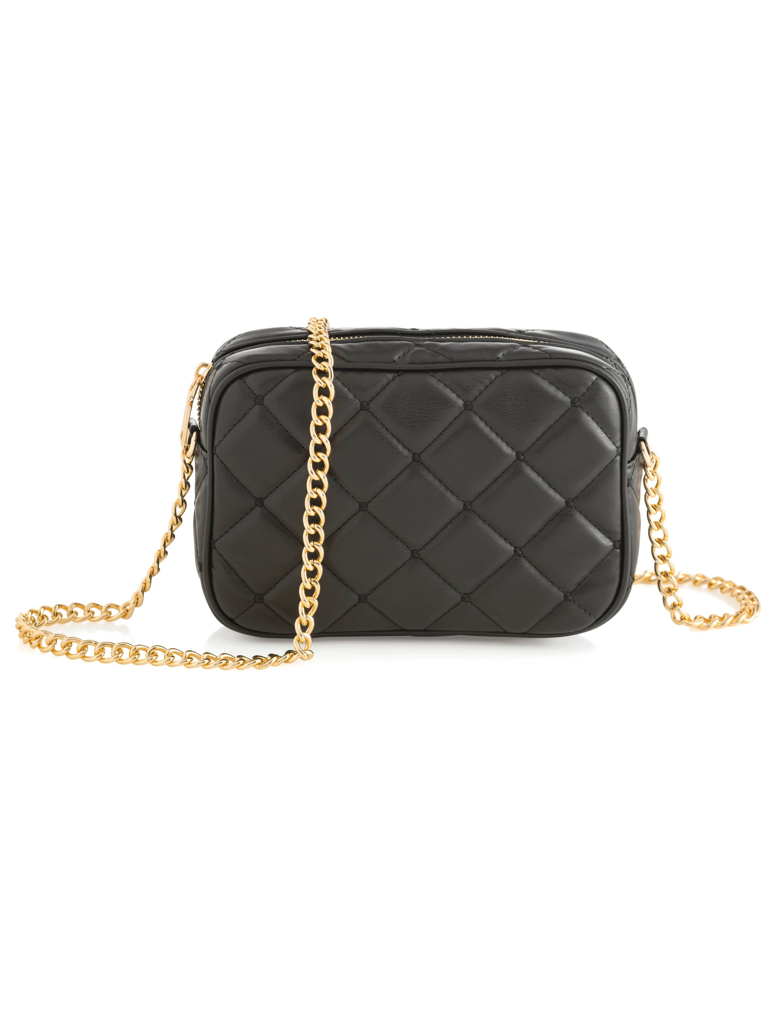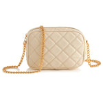 quilted pu; gold hardware; cross-body chain; top zip closure; 1 inner zip pocket, 1 inner slip pocket