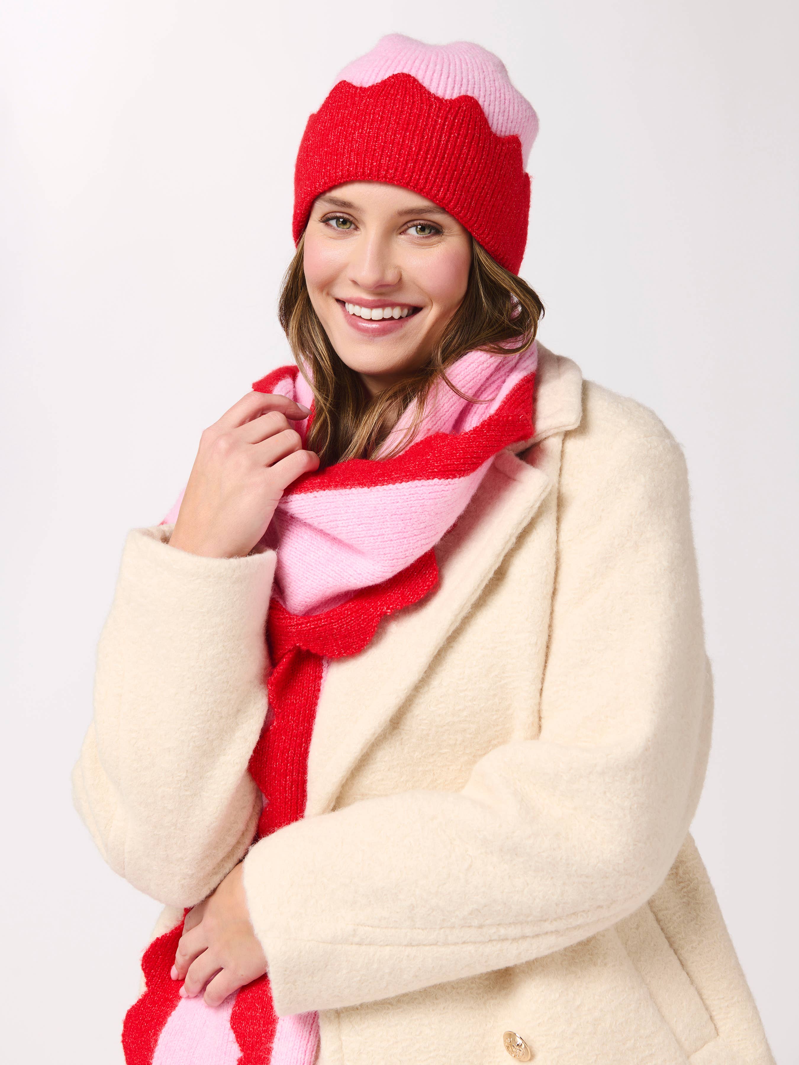 One Size, Made from polyester and spandex, Make chilly days cuter with the Melody Beanie, a playful cold-weather staple with bold contrast colors and a whimsical scalloped design. Its cozy knit construction keeps you snug while the fold-over cuff adds that extra bit of warmth. Available in a range of fun, eye-catching color combos, this beanie is anything but basic. Whether you're heading out or hunkering down, it’s the perfect accessory to brighten up your winter.
