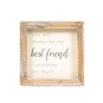 5x5x1.5 wood frame sign (BEST FRIEND) white/natural. Capture the essence of true friendship with our 5x5x1.5 Wood Frame Sign bearing the endearing message "You will always be my best friend, you know too much".