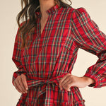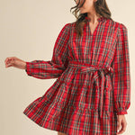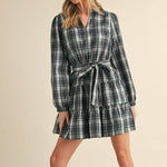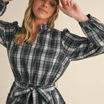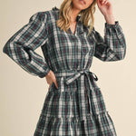 Romantic vibes are here thanks to this plaid mini dress! Lightweight woven fabric boasts a playful plaid design as it shapes this sweet dress that has a ruffled V neckline and elastic waist with belt loops and a tying sash. Long puff sleeves frame this bodice that ends with a ruffle tiered mini hem.