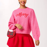 Made from 79% polyester, 14% acrylic, 4% wool, 3% elastane. Hand wash, dry flat. Low iron, reverse side only, Assorted Set contains 1 x S, 2 x M, 2 x L, 1 x XL. The “Merry” Sweater is your go-to look for instant holiday cheer. Made from a cozy, soft knit, this cheery pink pullover features festive red script that spells out “Merry” in joyful style. With its relaxed fit and classic crew neckline, it’s perfect for everything from gift wrapping to clinking glasses at your next holiday happy hour. Pair it with a plaid mini or sparkly accessories for a look that’s equal parts sweet and spirited.