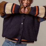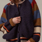 Wrap yourself in warmth with this chunky rib-knit cardigan featuring a plush faux fur lining and bold retro stripes. Perfect for layering over basics or pairing with lounge sets on chilly days.