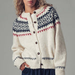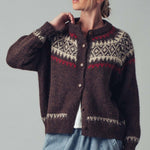 Wrap yourself in cozy charm with this Fair Isle knit cardigan, featuring a Nordic-inspired pattern and soft wool-blend texture. Unique toggle buttons, ribbed trim, and a relaxed fit make it a perfect layering piece for fall and winter looks.