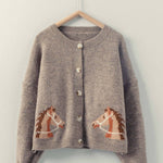 Make a statement in this charming cardigan featuring a playful horse graphic and classic ribbed trim detailing. The crew neckline and button-front design create a versatile silhouette perfect for western-inspired layering. The premium acrylic blend ensures cozy comfort while maintaining shape.