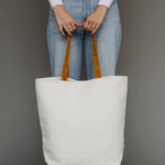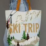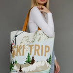White, lt. blue & green ski resort scene tote Tan "SKI TRIP" textured text Leather straps 17.5"x6.5"x16" 100% Cotton Min. Qty. 2