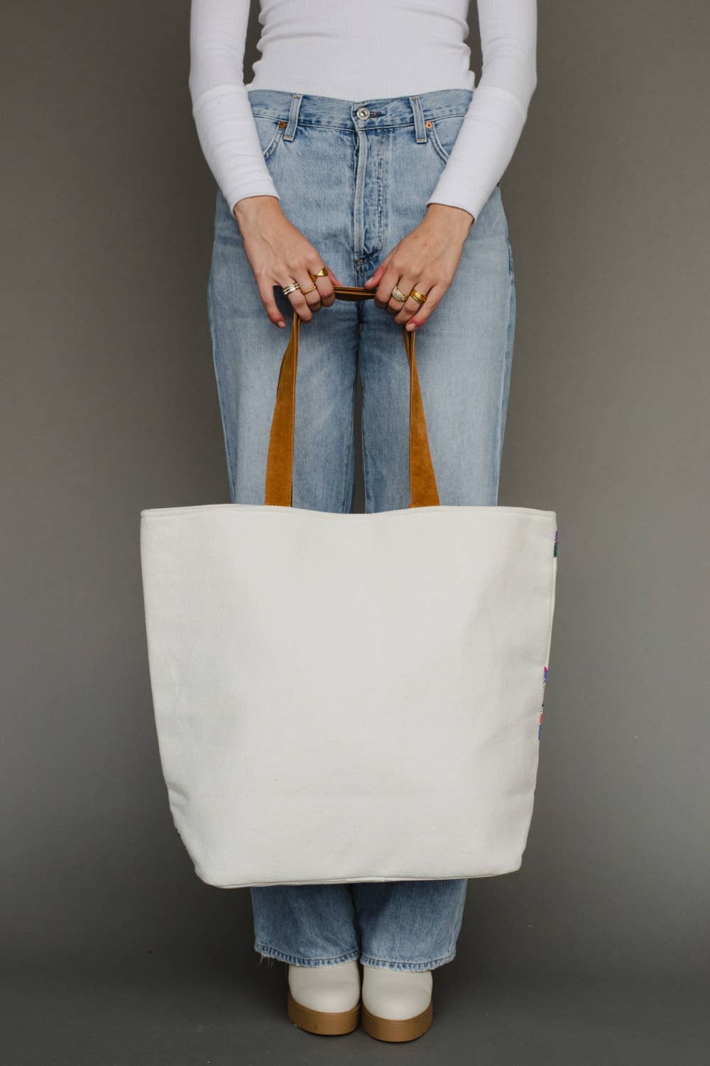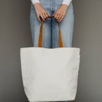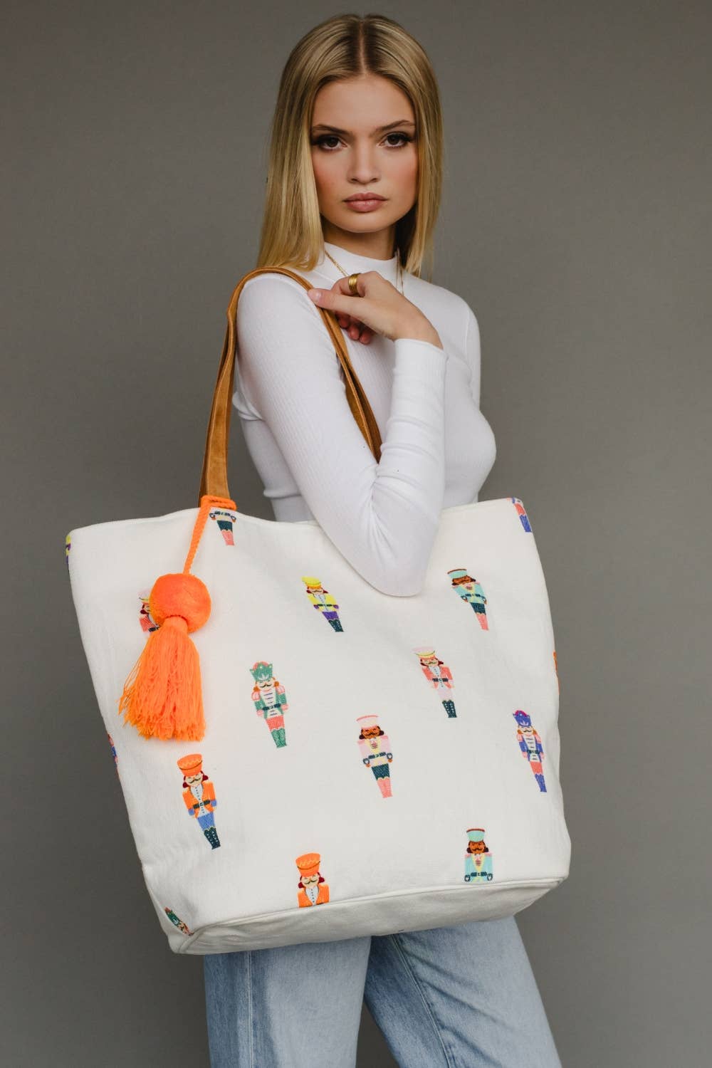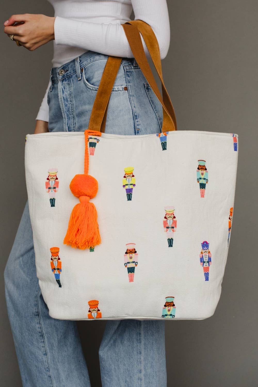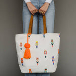 White tote Nutcracker graphic on the front Orange pom tassel 17" x 6.5" x 14.5" 100% Cotton Min Qty. 2