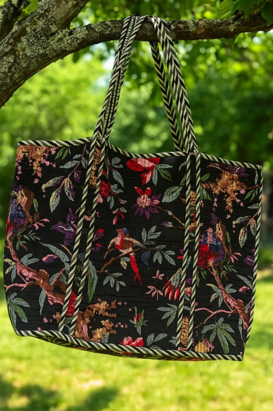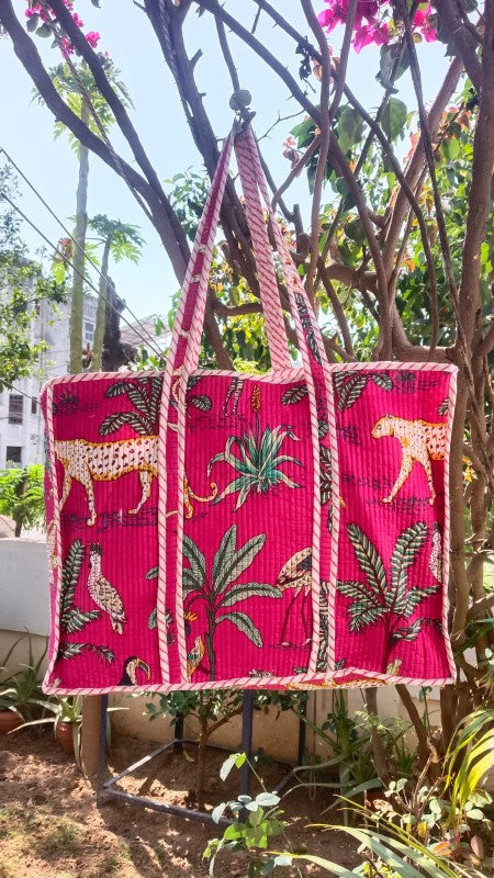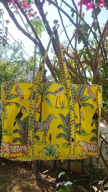 Infuse your day with a touch of wild elegance! Our Jungle Safari Tote Bag in vibrant green brings the spirit of the tropics to your everyday adventures. Handcrafted from 100% premium cotton, this quilted tote showcases traditional Indian handblock printing featuring zebras, leopards, parrots, and lush foliage a celebration of nature and craftsmanship.