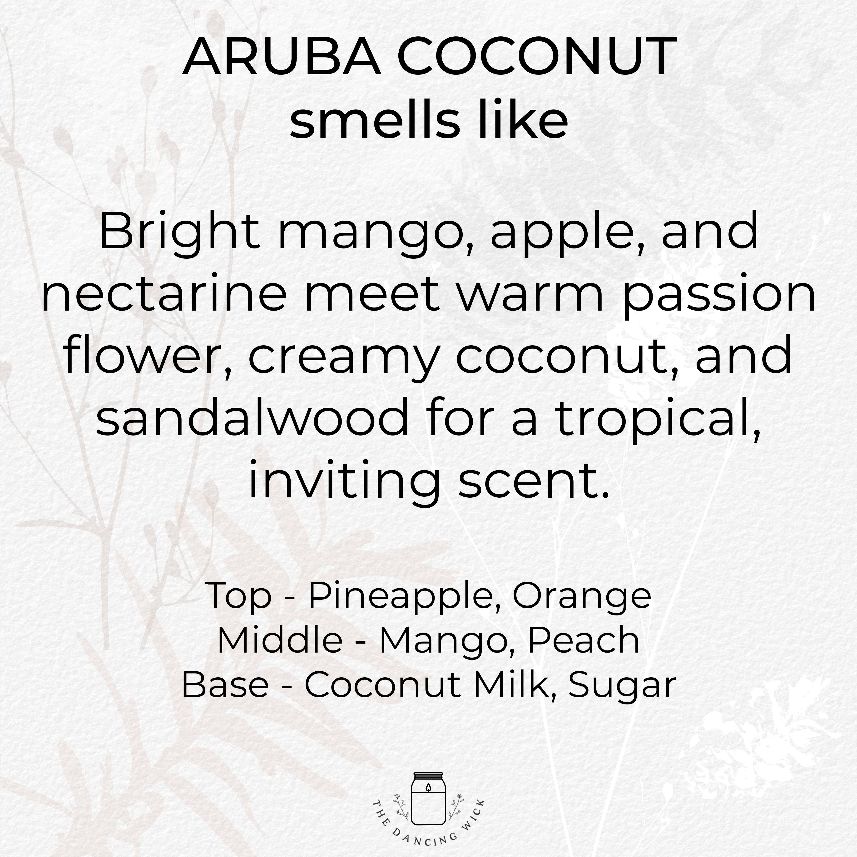 Take your senses on a lavish vacation to Aruba with this fragrance! Juicy mango and apple are blended together with white nectarine to create a citrus burst at the top with this accord while passion flower and vanilla orchid set the tone for the hear to f the fragrance. Coconut cream and Tahitian vanilla blend perfectly with sandalwood to complete this destination fragrance. -Dancing Wick Original