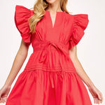 Flutter sleeve baby doll midi dress in cotton poplin fabric. This mini babydoll style dress features fluttered ruffle short sleeves with top stitch detail, a split V-neck, side pockets, mini skirt with top stitched hem, side zipper closure, pin-tuck detail at shoulder/skirt, a removable waist tie, and cinched banded waist with stretch smock at back.