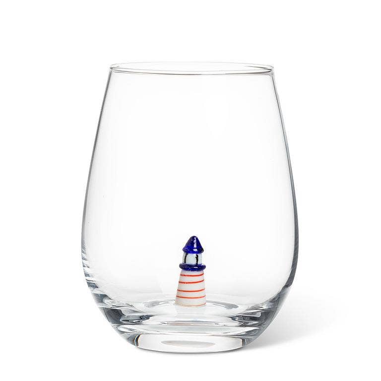 Enhance your sipping experience with our Stemless Glass featuring a lighthouse at the bottom. The icon at the base adds a whimsical and sweet accent to the modern stemless design.