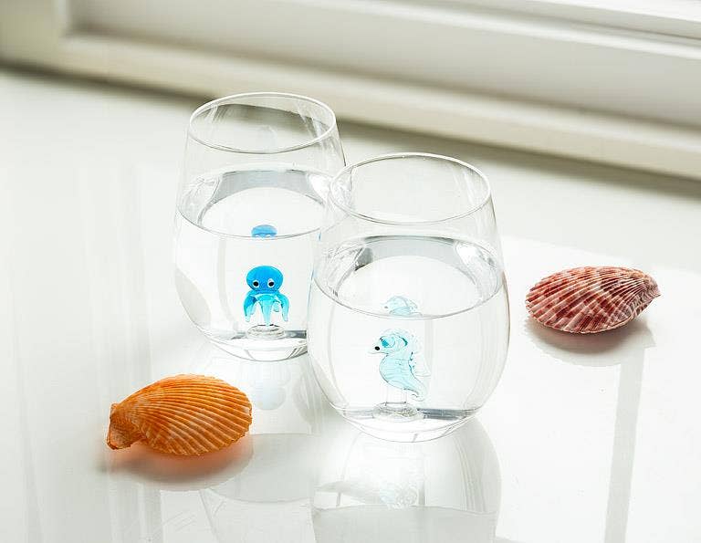 Enhance your sipping experience with our Stemless Glass featuring an octopus at the bottom. The icon at the base adds a whimsical and sweet accent to the modern stemless design.
