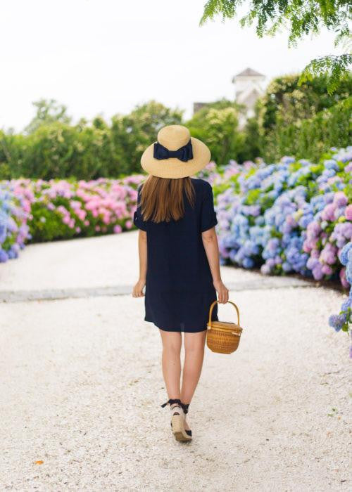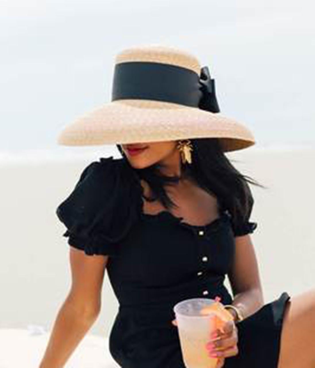 Your custom New England-inspired Lisi Lerch sun hat pairs perfectly with our handmade beaded statement earrings and a one-of-a-kind ata grass woven bali bag.