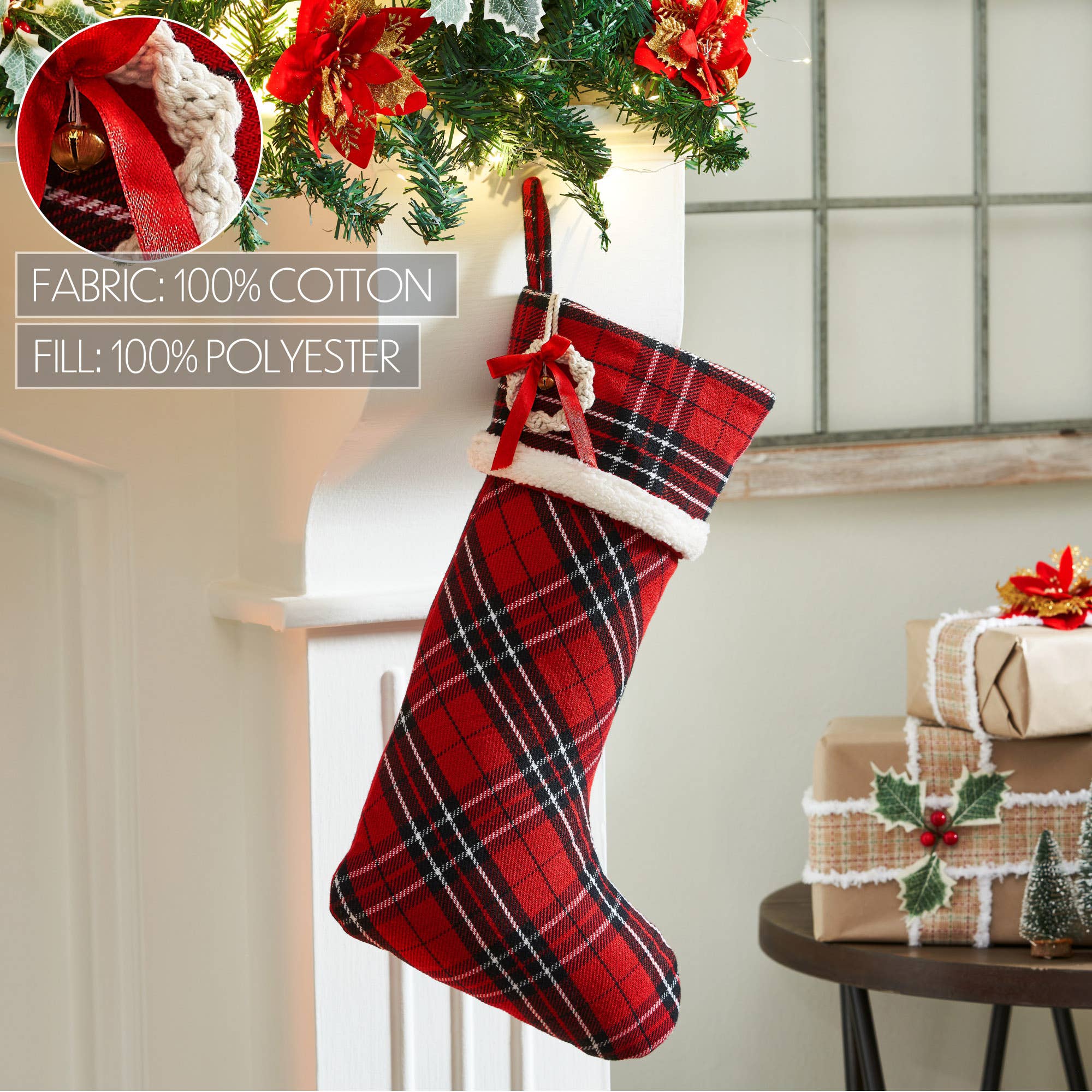 Bring timeless holiday charm to your decor with the VHC Brands Tartan Plaid Stocking. Measuring 11x18 inches, this traditional stocking features a classic tartan plaid pattern in deep red, country black, and white. Its rich colors and iconic design evoke cozy winter evenings and festive gatherings, making it a perfect addition to any Christmas mantel or holiday display. Crafted from soft, durable cotton, this stocking offers both style and substance. The traditional plaid pattern lends a warm, rustic feel that complements farmhouse, classic, and country Christmas themes. Whether hung on the mantel, staircase, or your favorite holiday nook, it adds a touch of nostalgic elegance and seasonal spirit to your home.