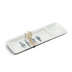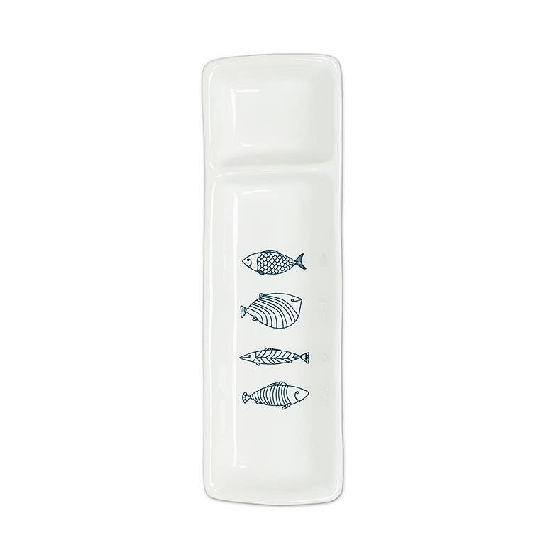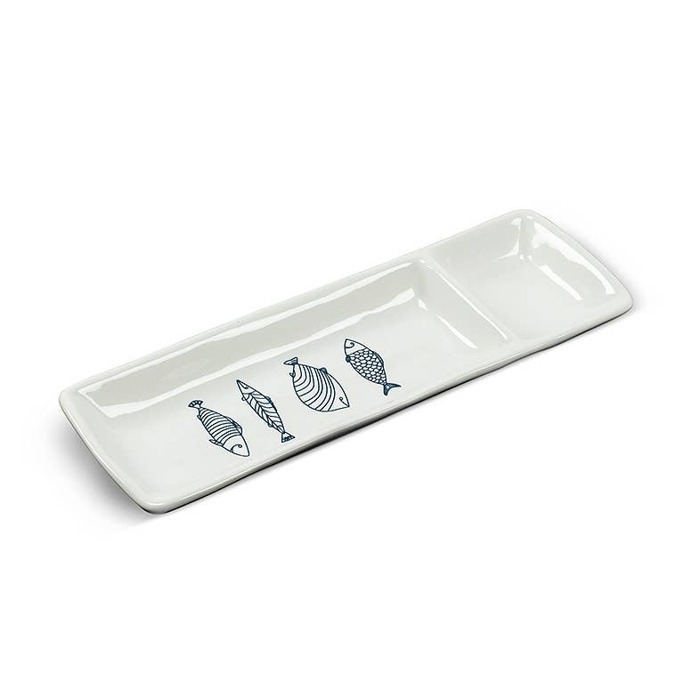 Enjoy more than just seafood with this two-section rectangular fish plate. Made of white stoneware with minimalist, Greek-inspired line-drawings of fish in blue, this uniquely-shaped dish features a separate section to hold a sauce or garnish alongside appetizers, hors d'oeuvres and more.