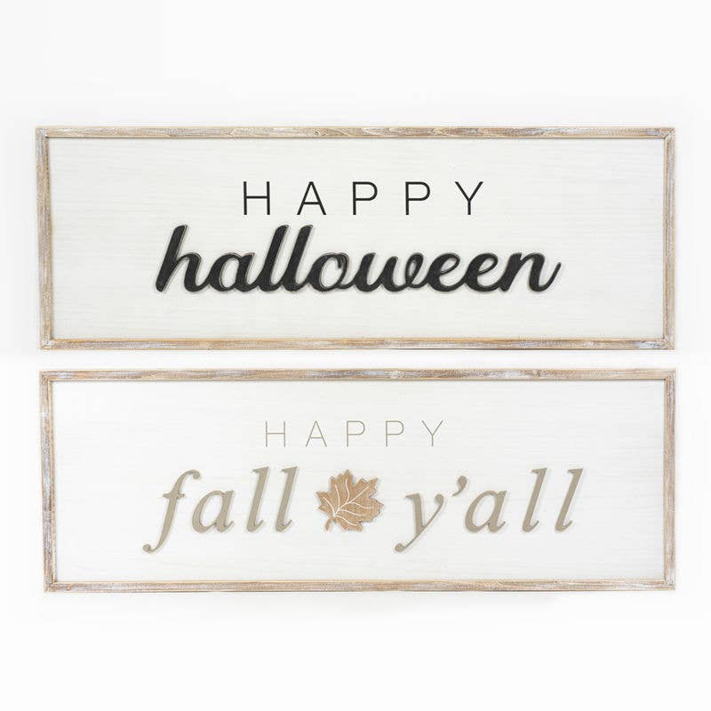 47x16x1.5 reversible wood framed sign (Happy Fall Y'all & Happy Halloween) white/grey/black