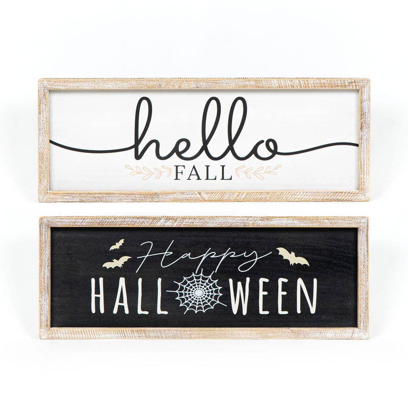 24.5x9x1.5 reversible wood framed sign (HELLO FALL / HAPPY HALLOWEEN) black/white/grey - Our reversible signs make the seasons last that much longer! This one flips to go from Fall to Halloween without missing a beat. Comes in a larger size as well! See 60235