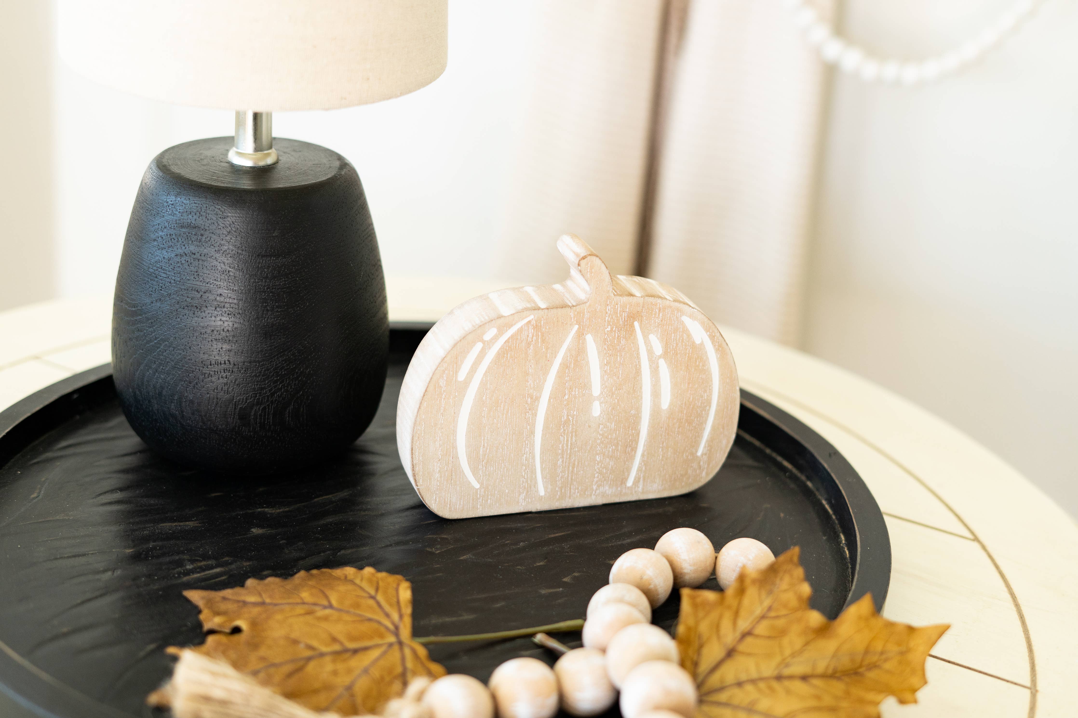 5x4 wood chunky shape. This natural and white colored pumpkin shape goes perfectly with all styles of Fall & Halloween collections!