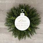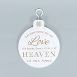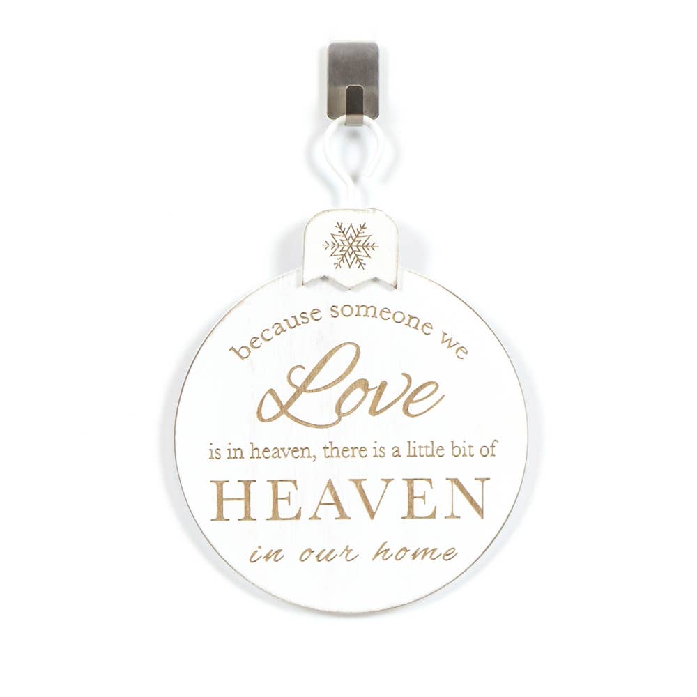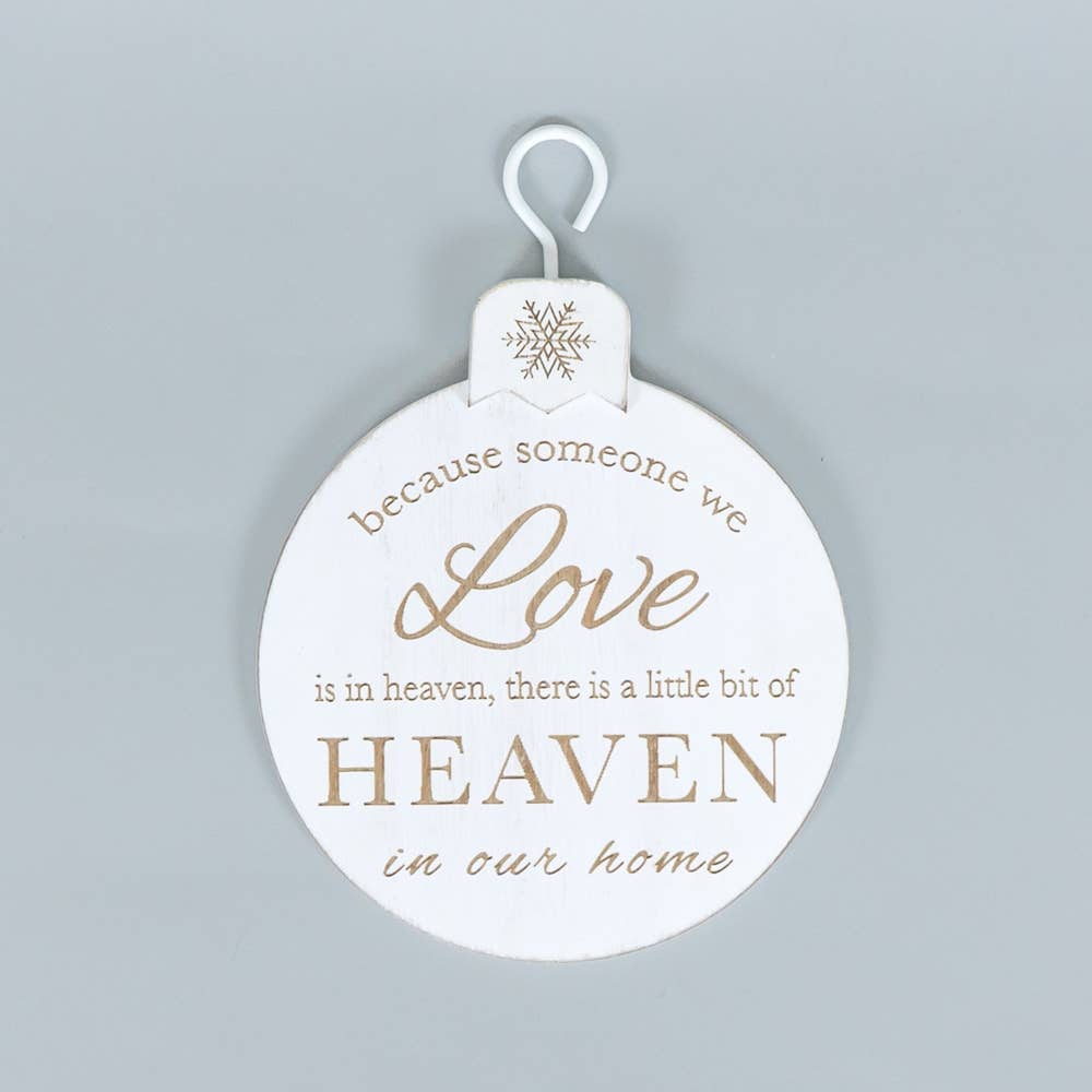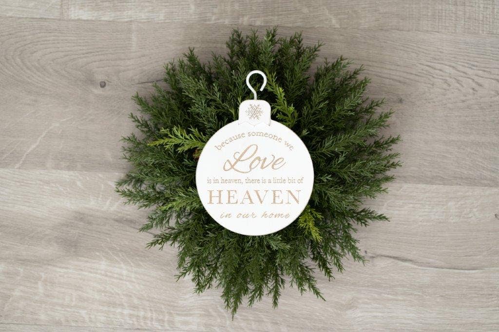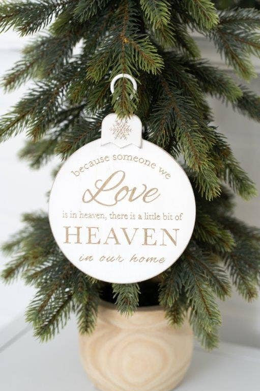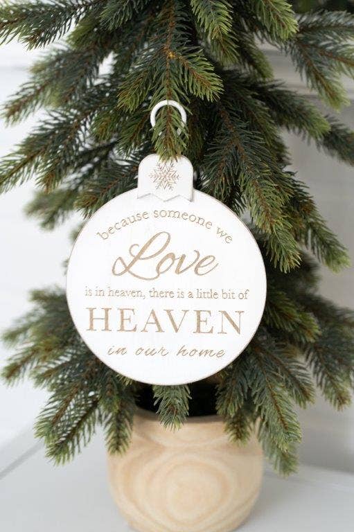5x7x.5 engraved wood ornament reads, "Because someone we love is in heaven, there is a little bit of Heaven in our home." Perfect for a Christmas tree to remember loved ones lost.