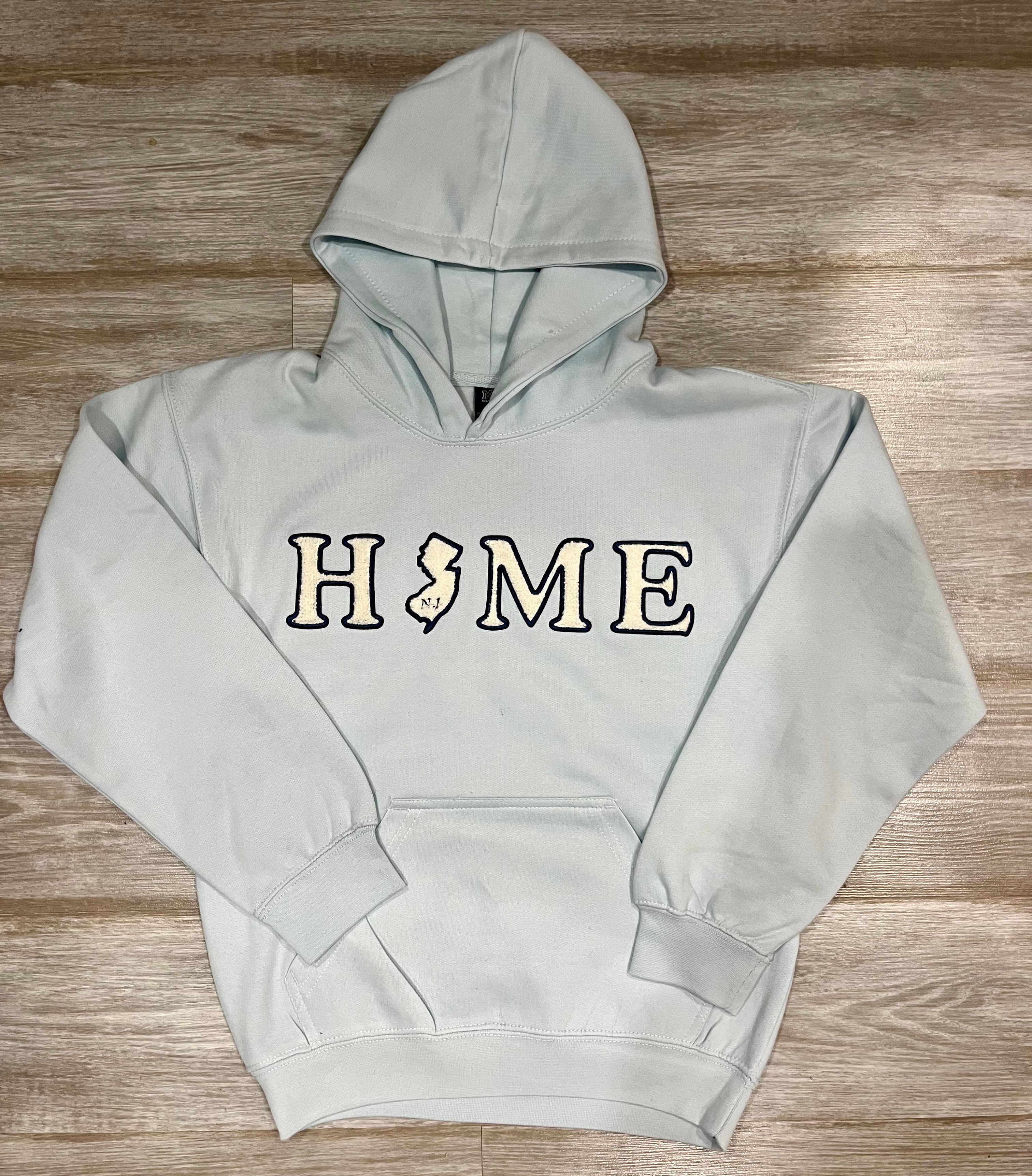 This Youth Home w NJ chenille hooded sweatshirt combines comfort and style with its soft chenille material, providing warmth and durability for everyday wear. The hooded design offers added protection against the elements, making it ideal for active youth. Featuring a bold Home with NJ emblem in textured chenille, it showcases state pride with a premium feel suitable for school, sports, or casual outings.
