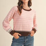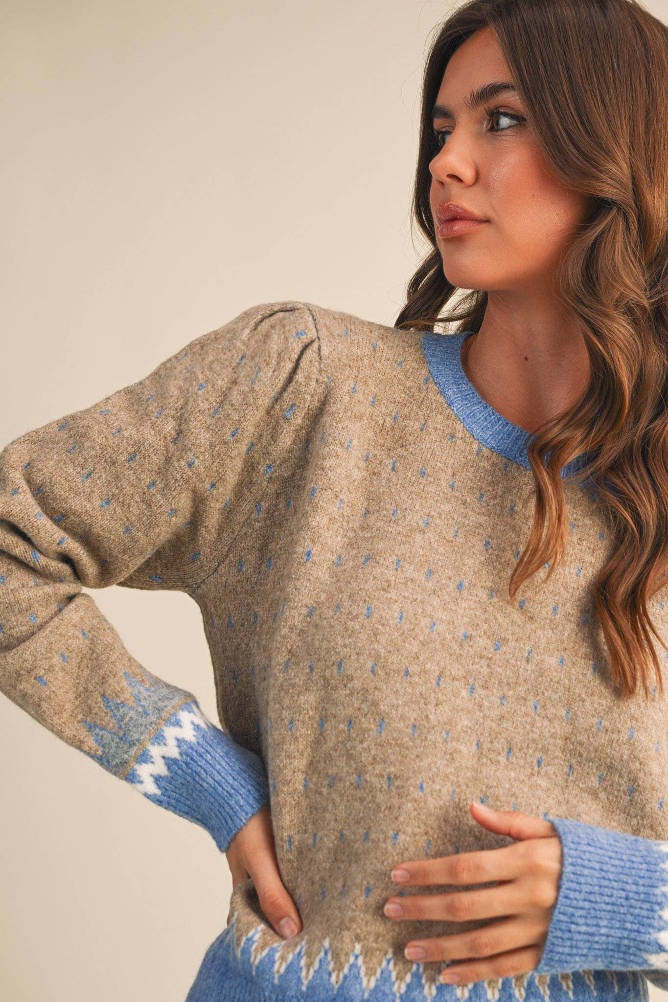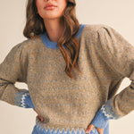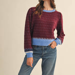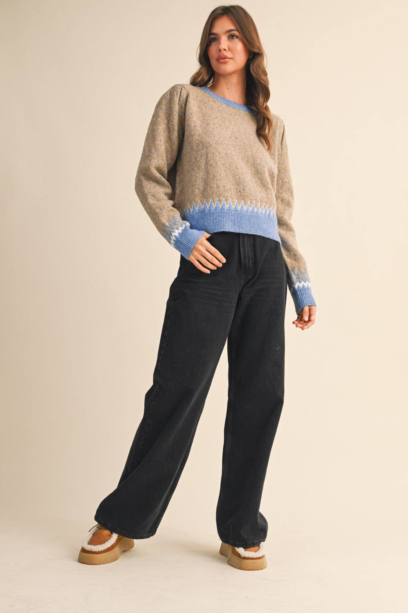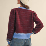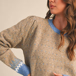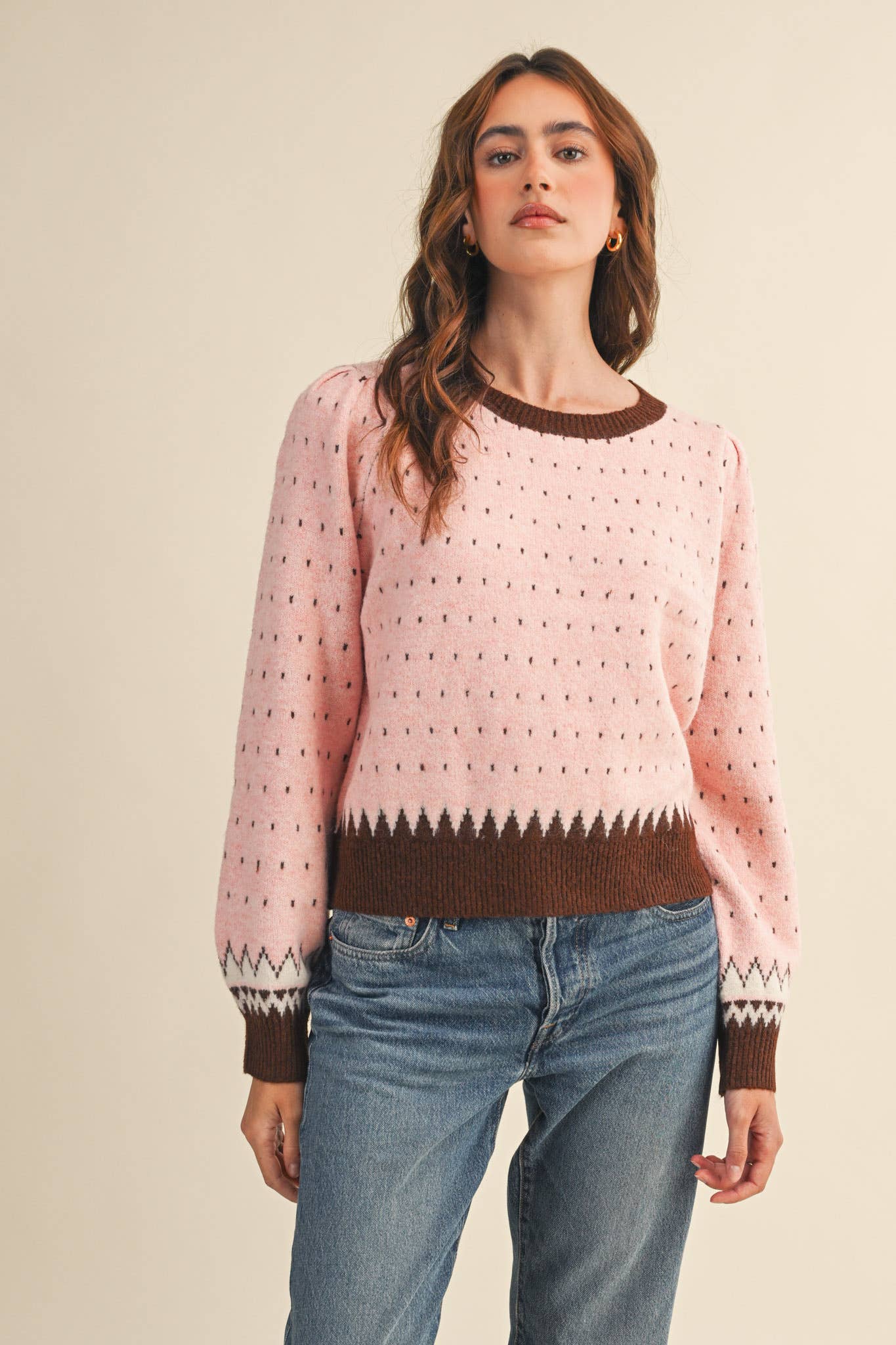 + Geometric knit sweater + Round neckline in contrast color + Long sleeves + Gathered puff shoulders + Ribbed neckline, cuffs, and hem + Model is 5' 7.5" 30-25-36 and wears a S