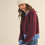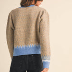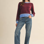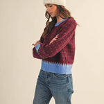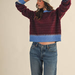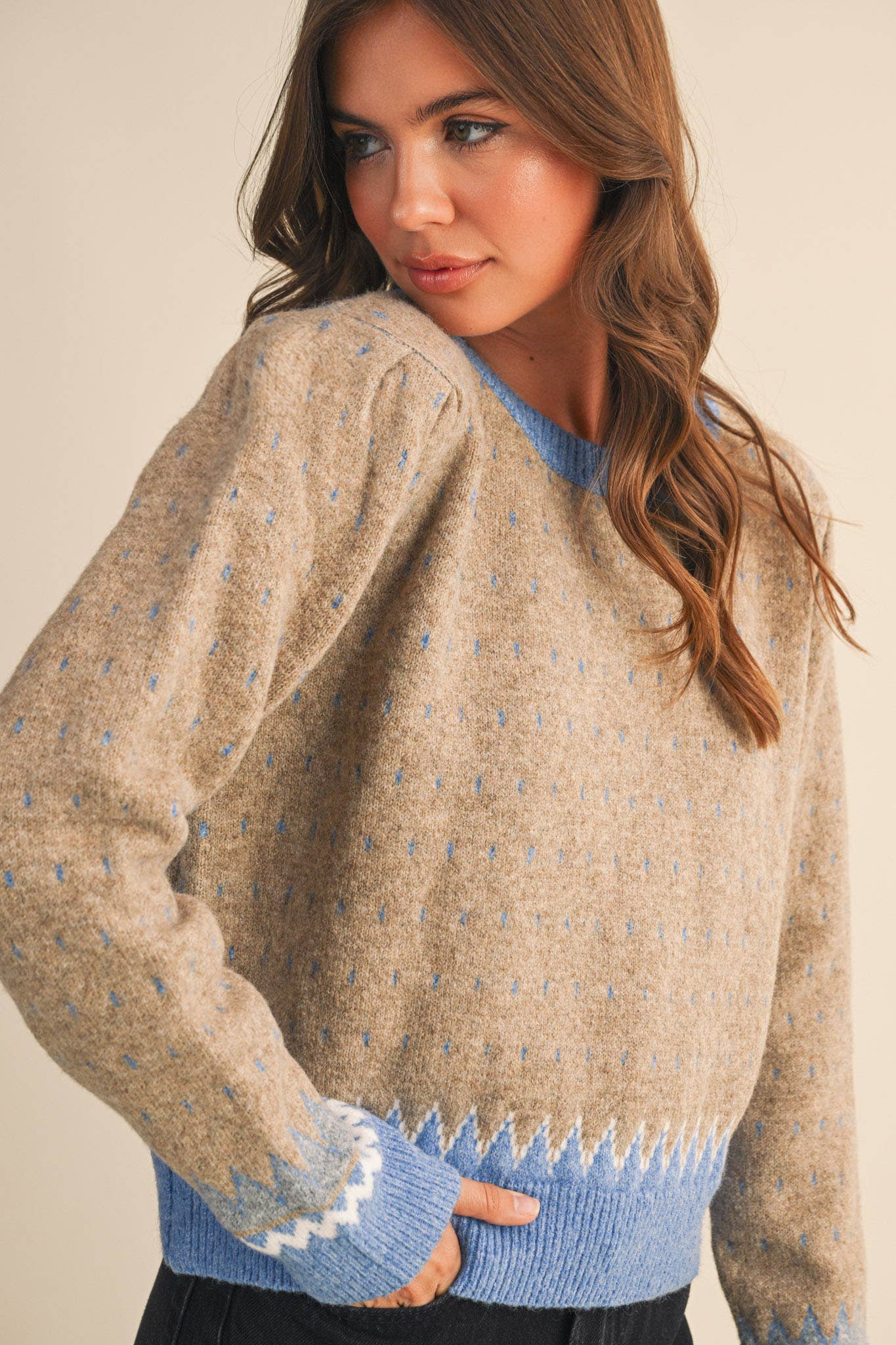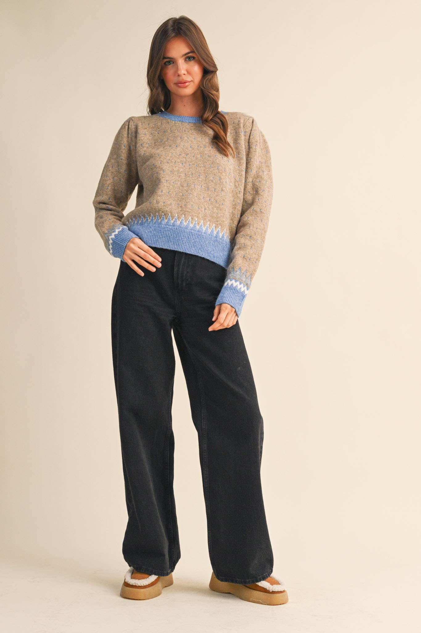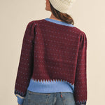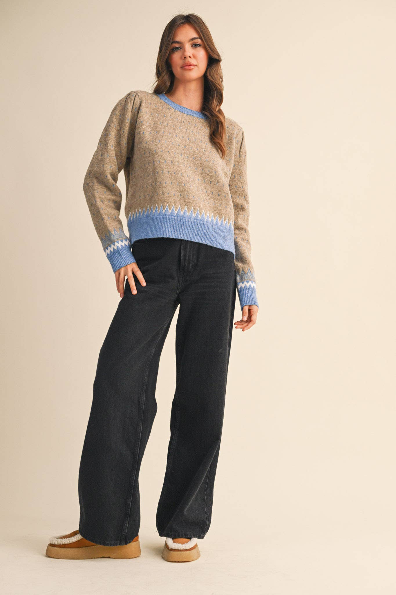 + Geometric knit sweater + Round neckline in contrast color + Long sleeves + Gathered puff shoulders + Ribbed neckline, cuffs, and hem + Model is 5' 7.5" 30-25-36 and wears a S