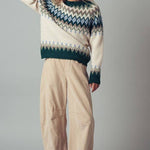 This premium knit sweater features a timeless Fair Isle pattern and is crafted from a soft wool blend for cozy warmth and classic winter style. Its slightly oversized silhouette makes it perfect for layering on chilly days.