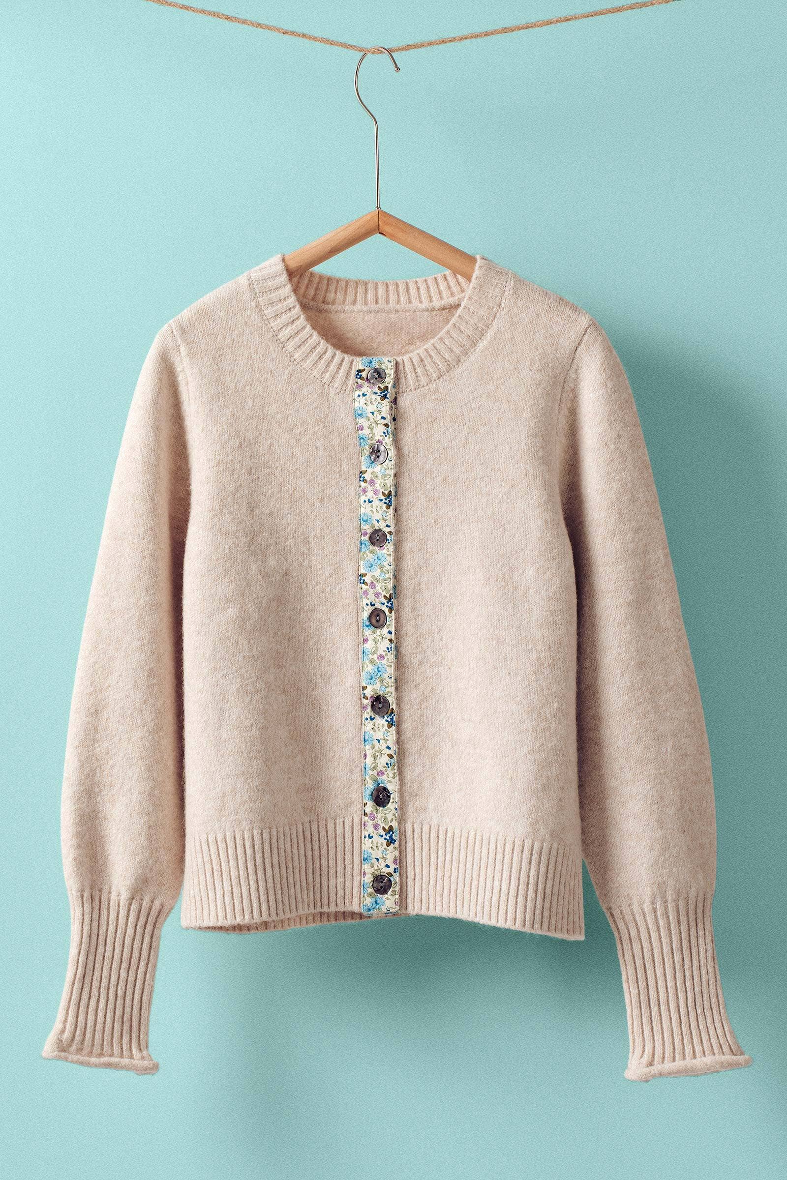 Charming and cozy, this cardigan blends softness with subtle florals. Featuring a delicate Liberty-style floral trim along the button placket, it's the perfect layering piece to add personality and polish to any outfit.