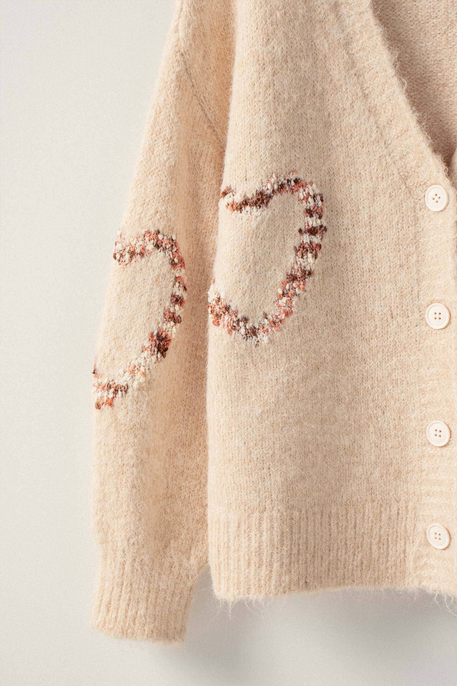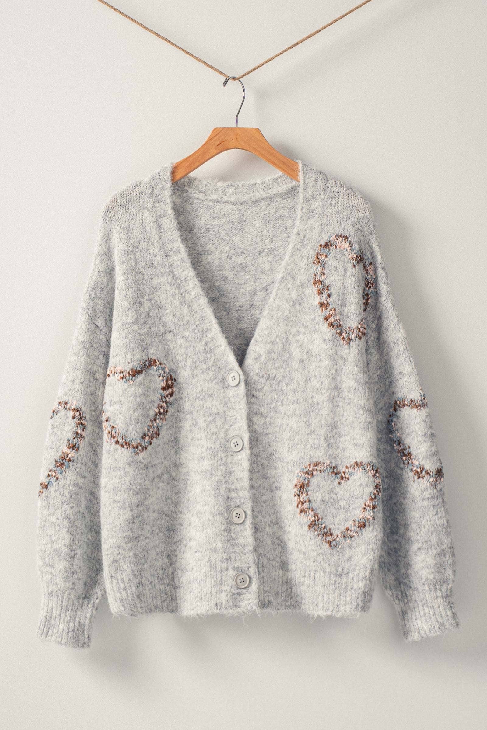 Sweet meets cozy in this charming heart-patterned cardigan crafted from a soft wool-blend knit. With a flattering V-neckline and secure button-front closure, it’s perfect for layering over tees or dresses on chilly days.