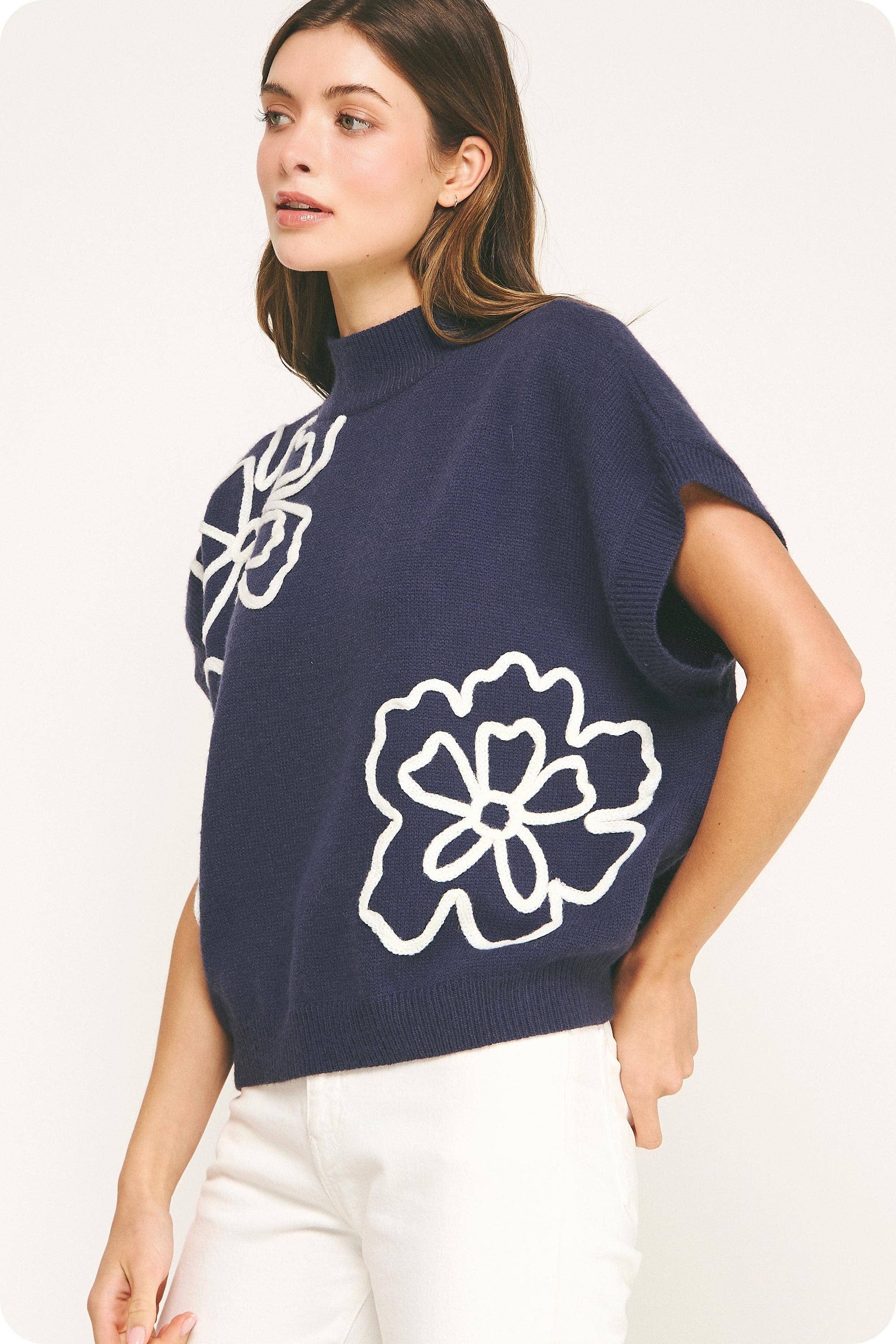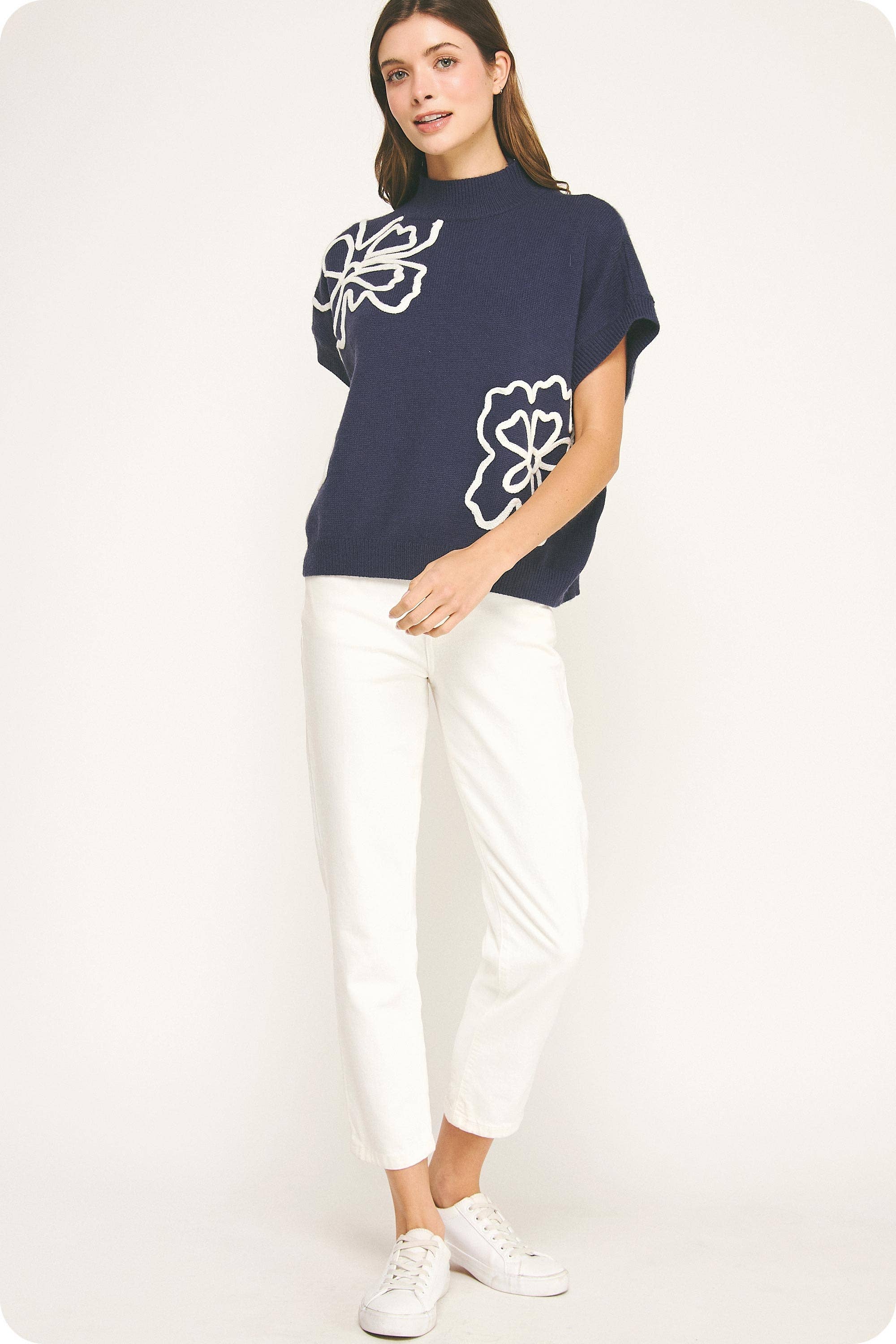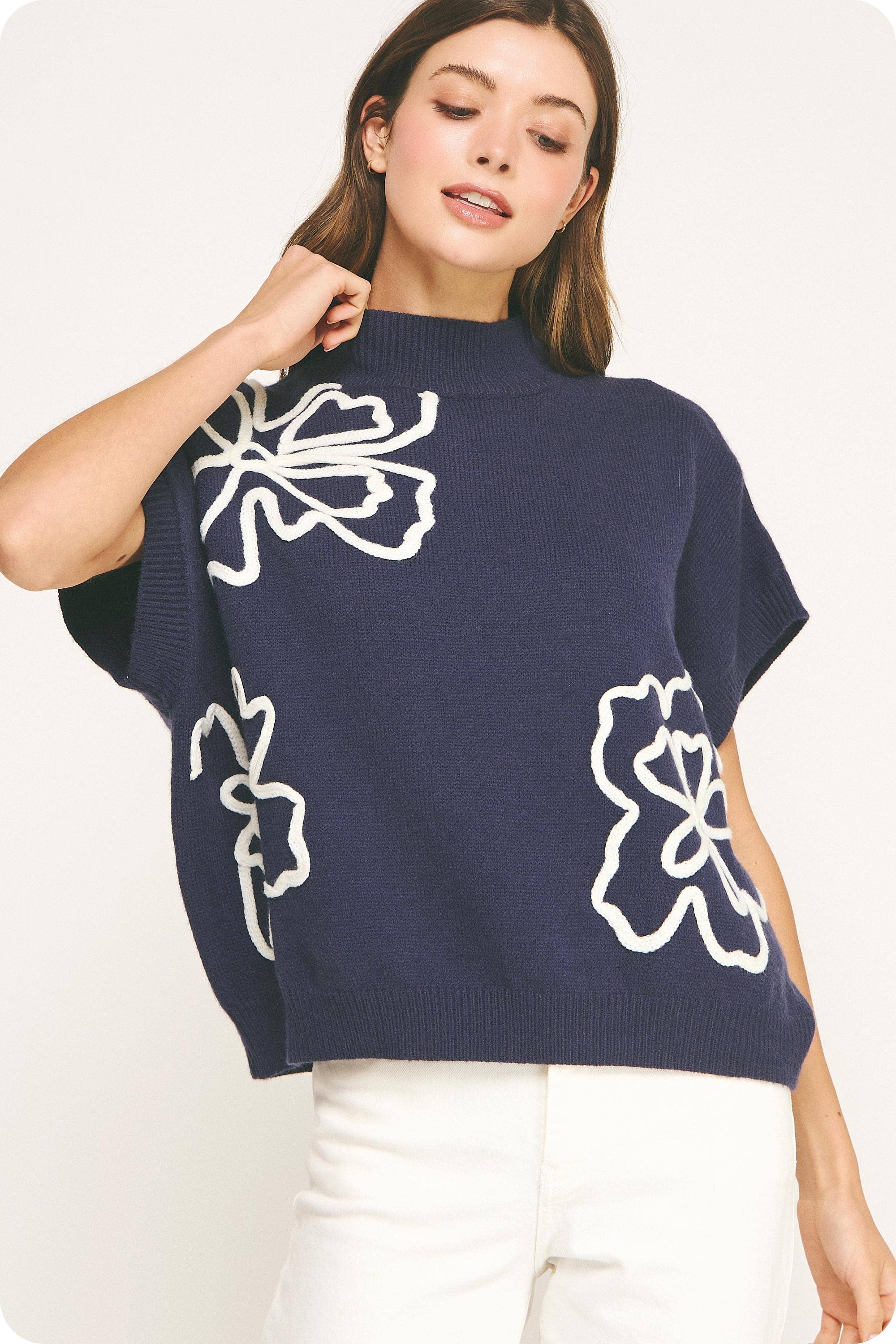 Floral embroidered sweater top in knit fabric. This relaxed knitted top features flower embroidery throughout, a ribbed mock neck, dropped shoulder sleeve with ribbed cuff, and a ribbed hem.