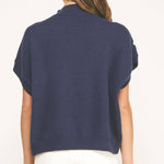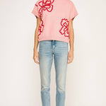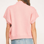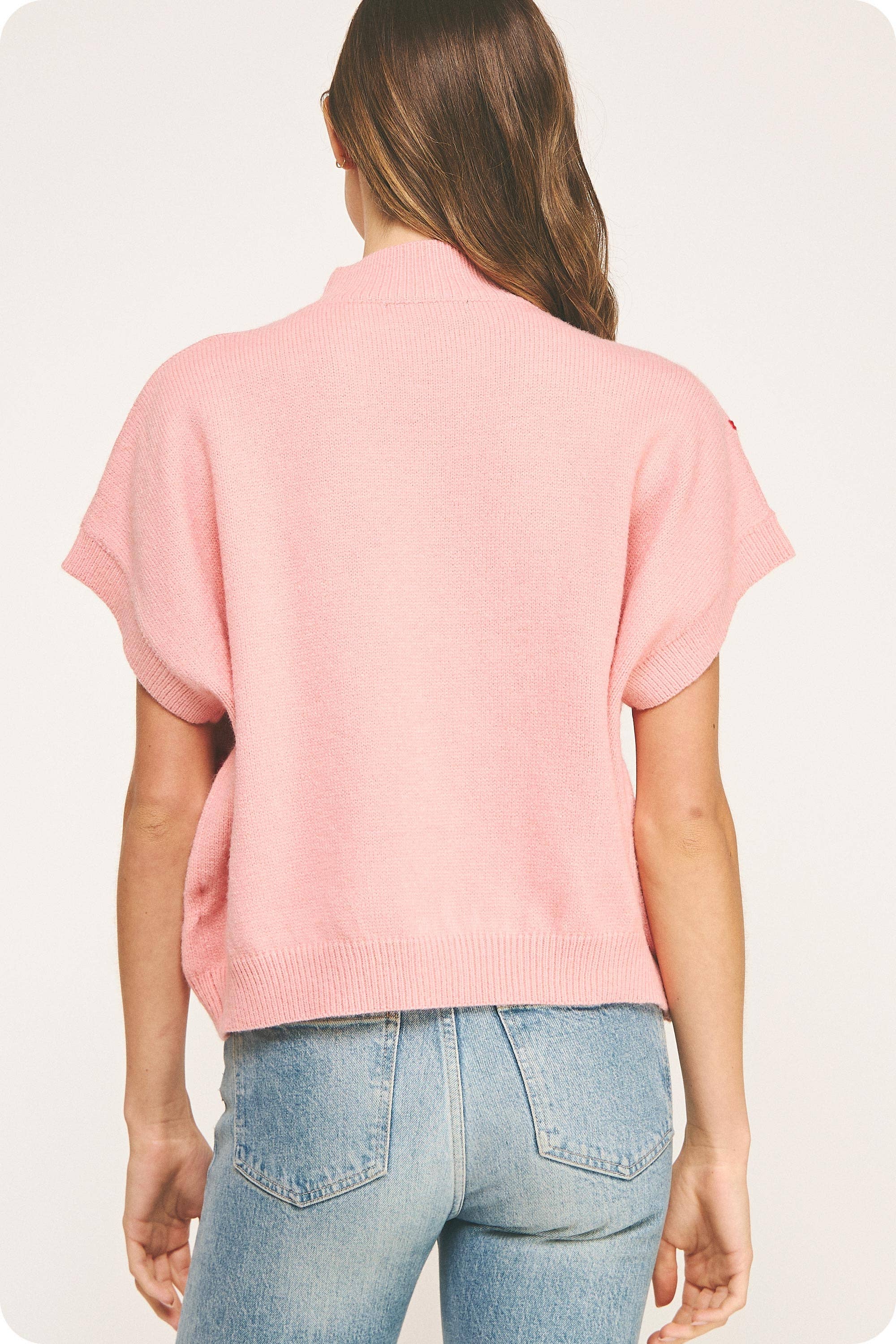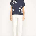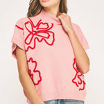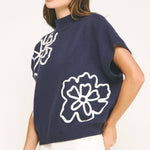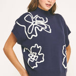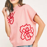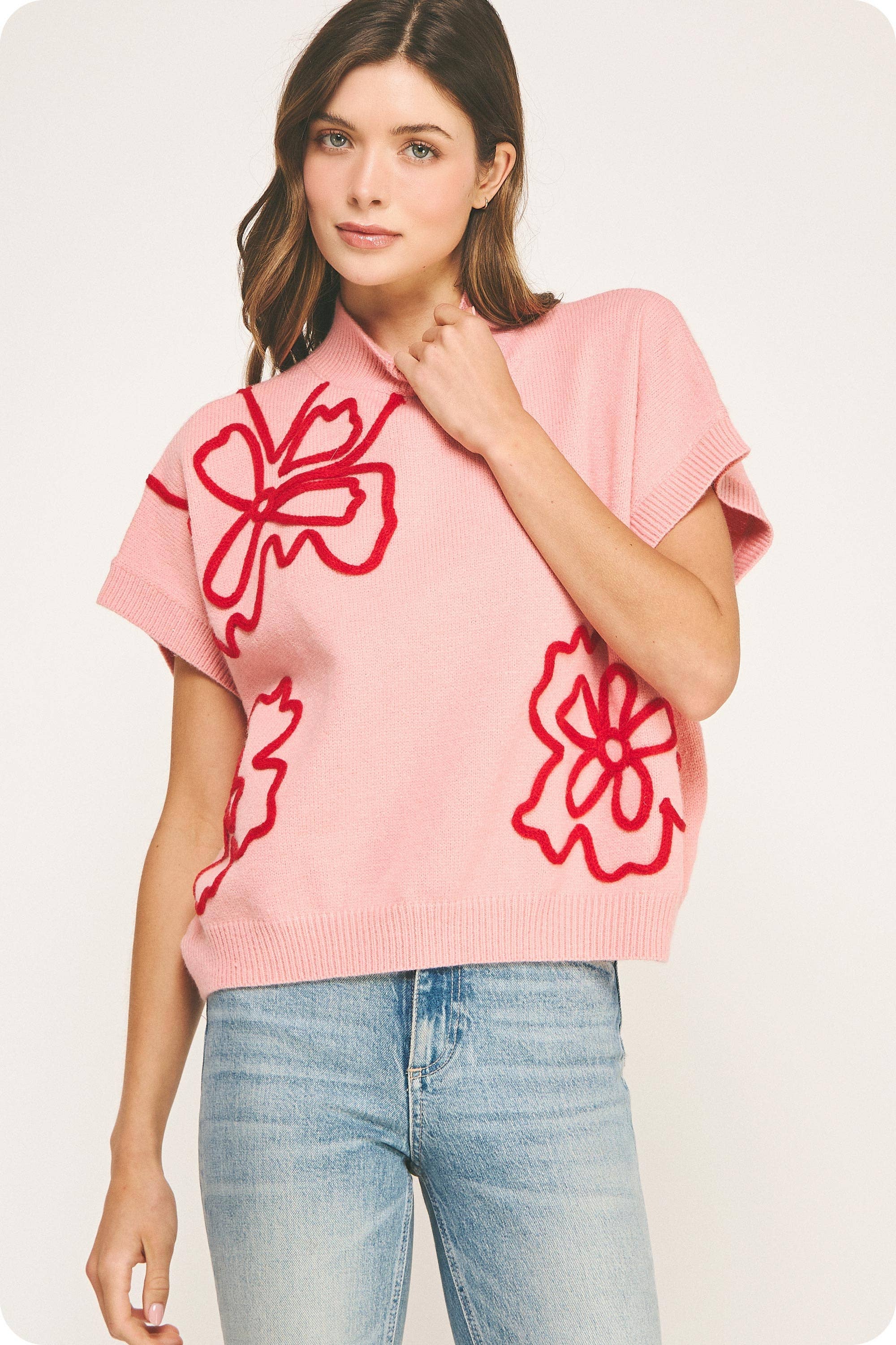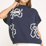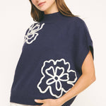 Floral embroidered sweater top in knit fabric. This relaxed knitted top features flower embroidery throughout, a ribbed mock neck, dropped shoulder sleeve with ribbed cuff, and a ribbed hem.