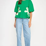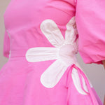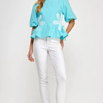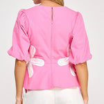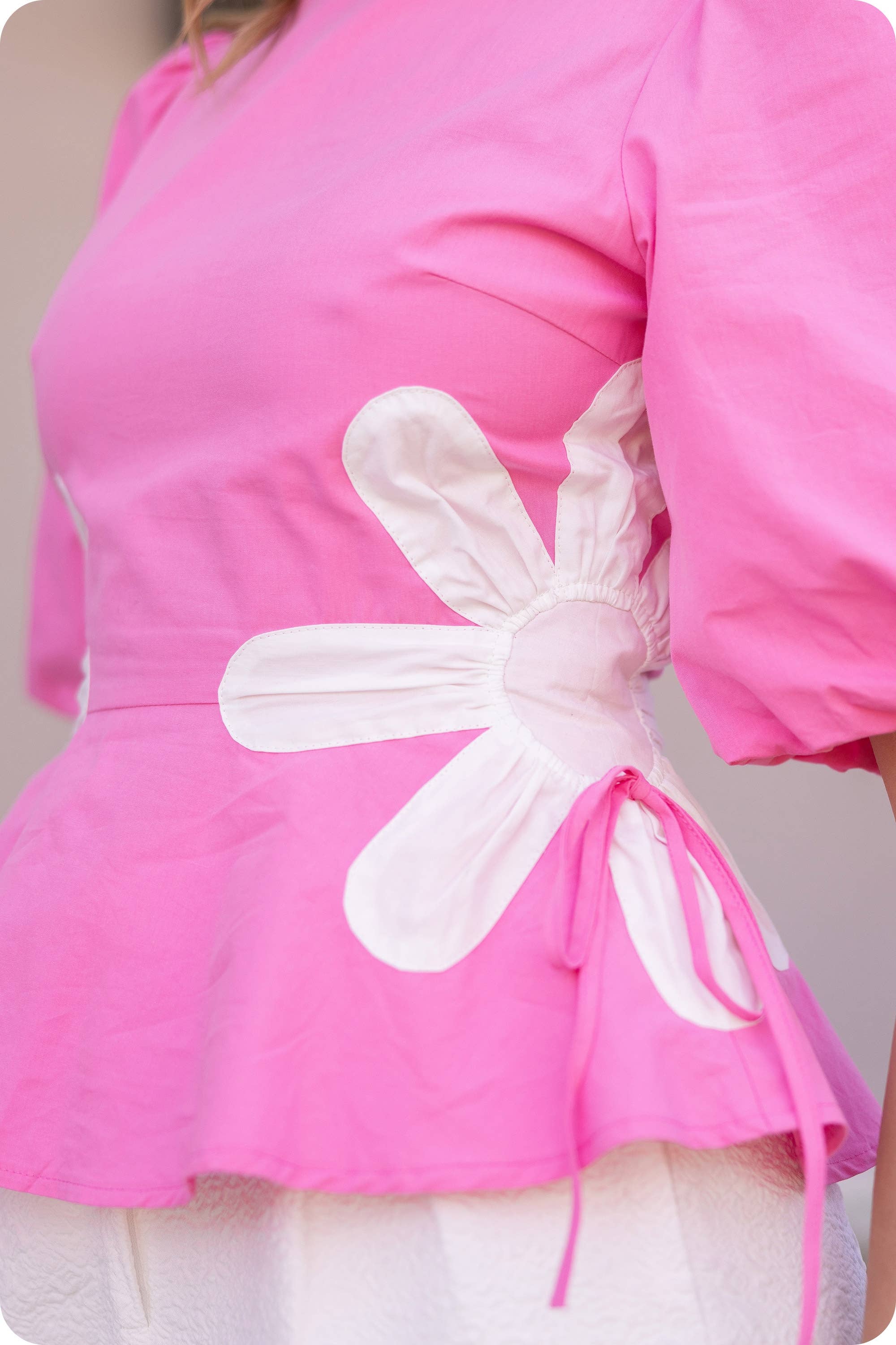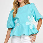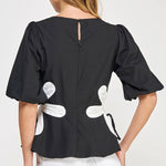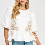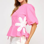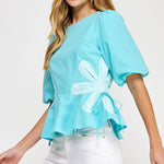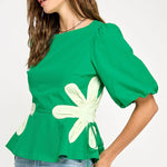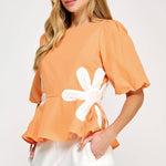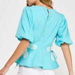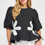 Flower detail color blocked blouse in cotton poplin fabric. This style features half puff sleeves, shirred shoulders, feminine patchwork flower detail at sides with tie detail, round neck and cinched waist with peplum hem.