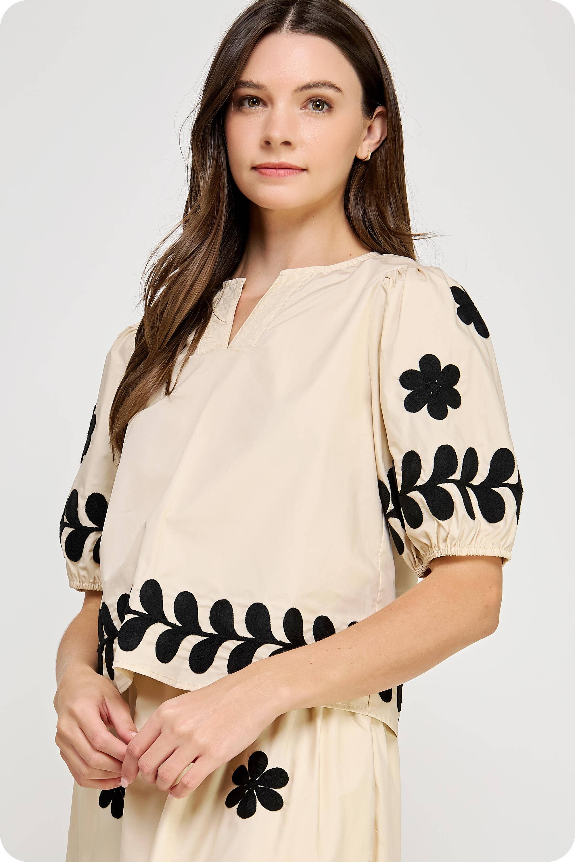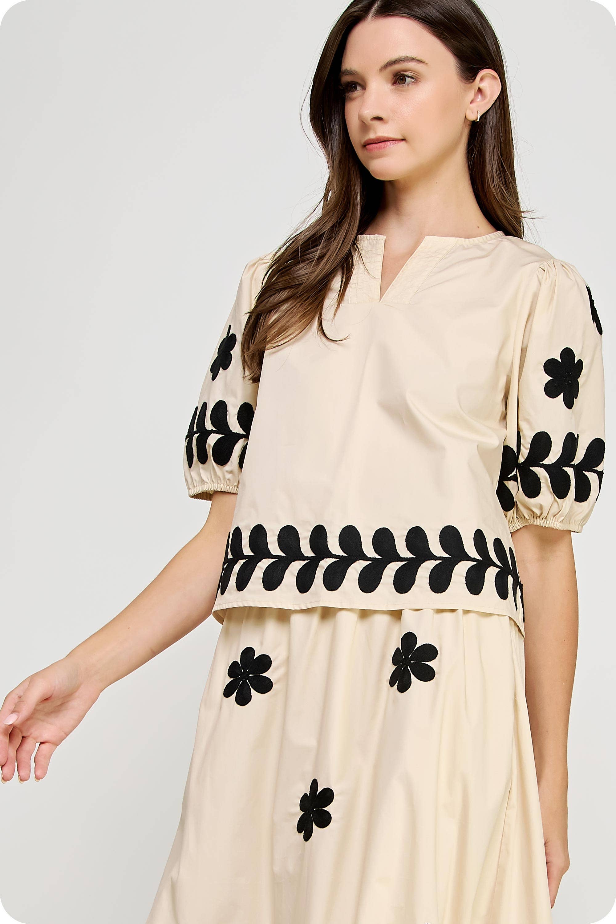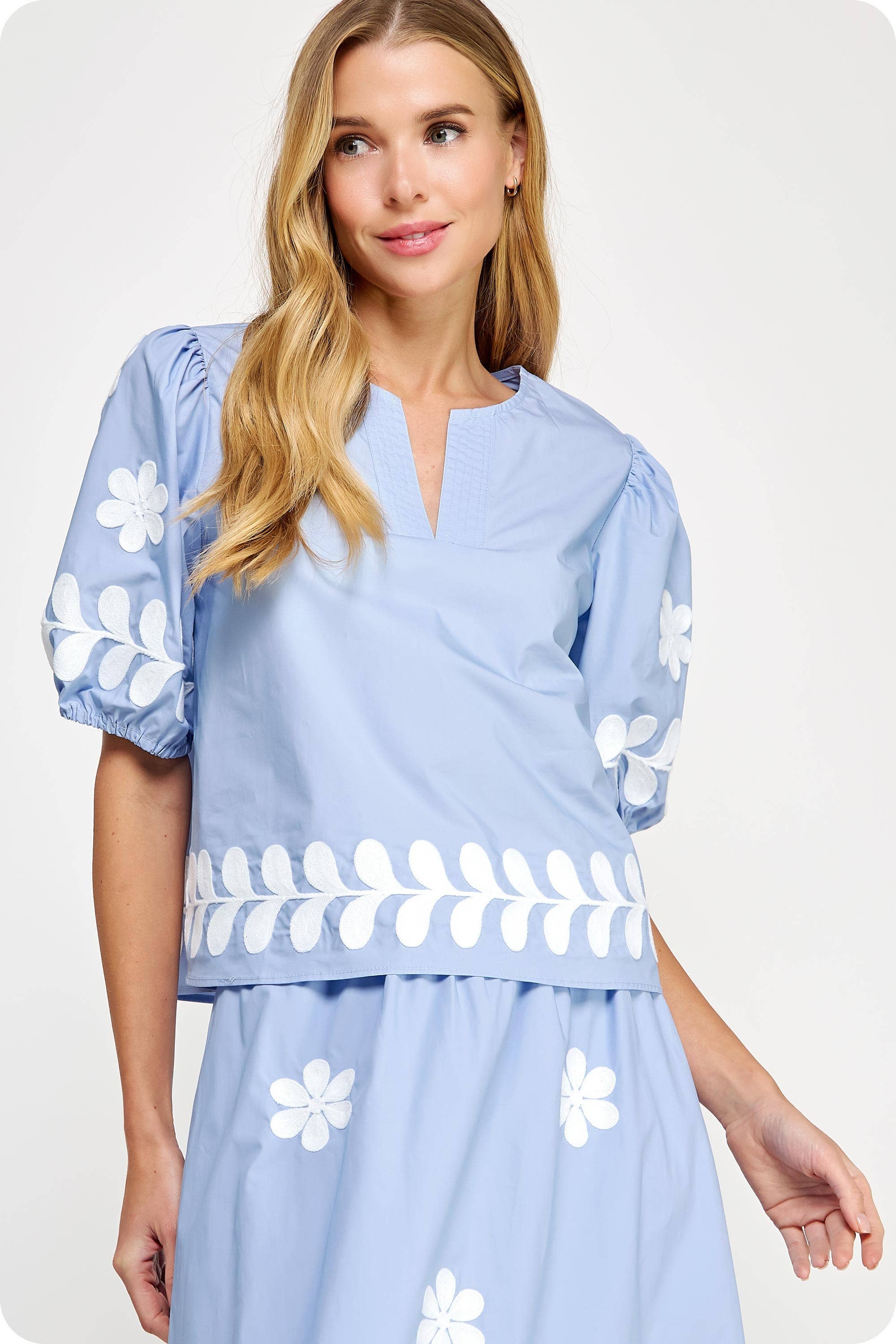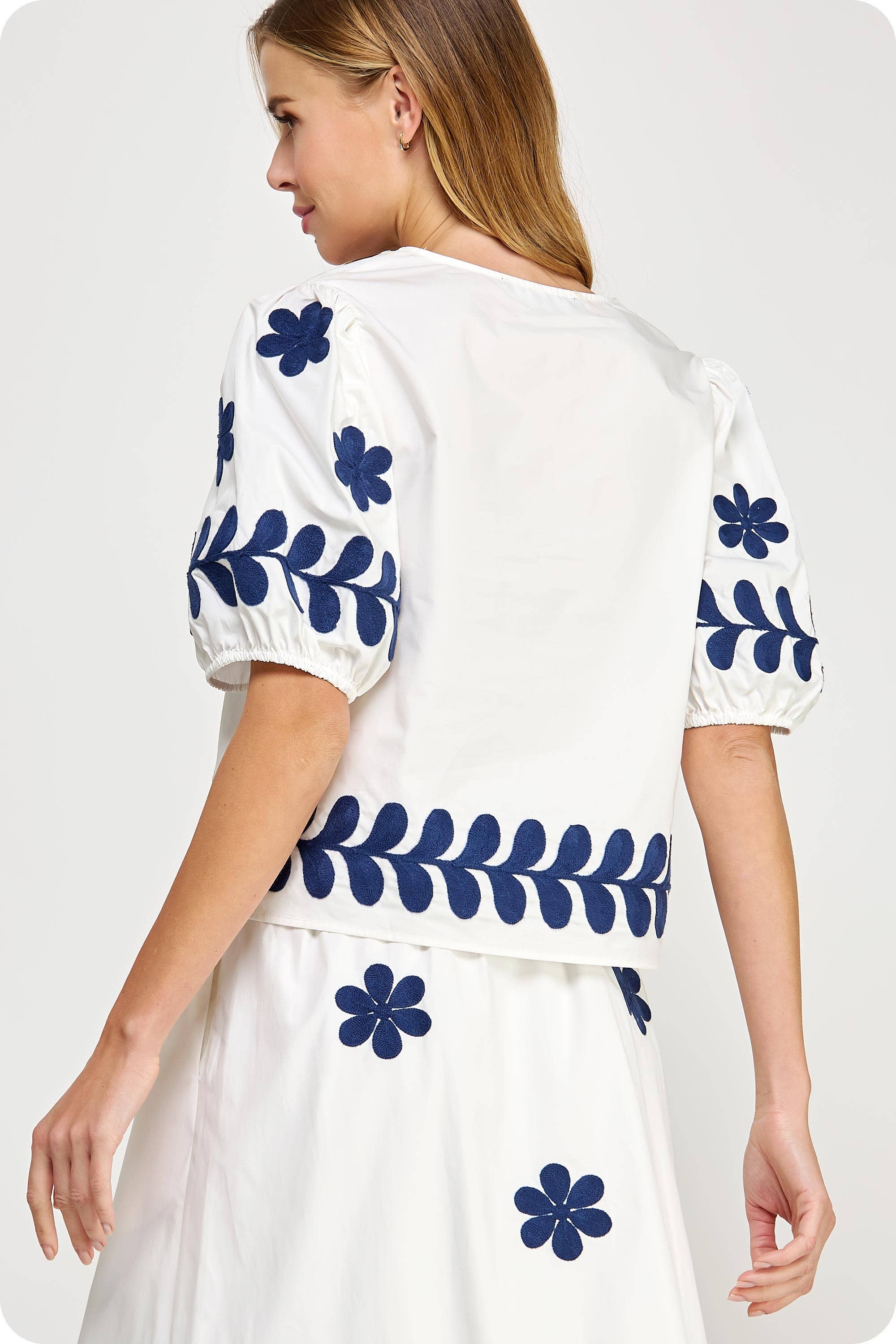 Floral embroidered blouse in cotton poplin fabric. This relaxed top features a split V neckline, short puff sleeves with elasticated cuff, statement floral embroidery throughout, and shirred shoulders. It can be made into a set with skirt S-8368-JK