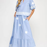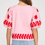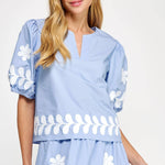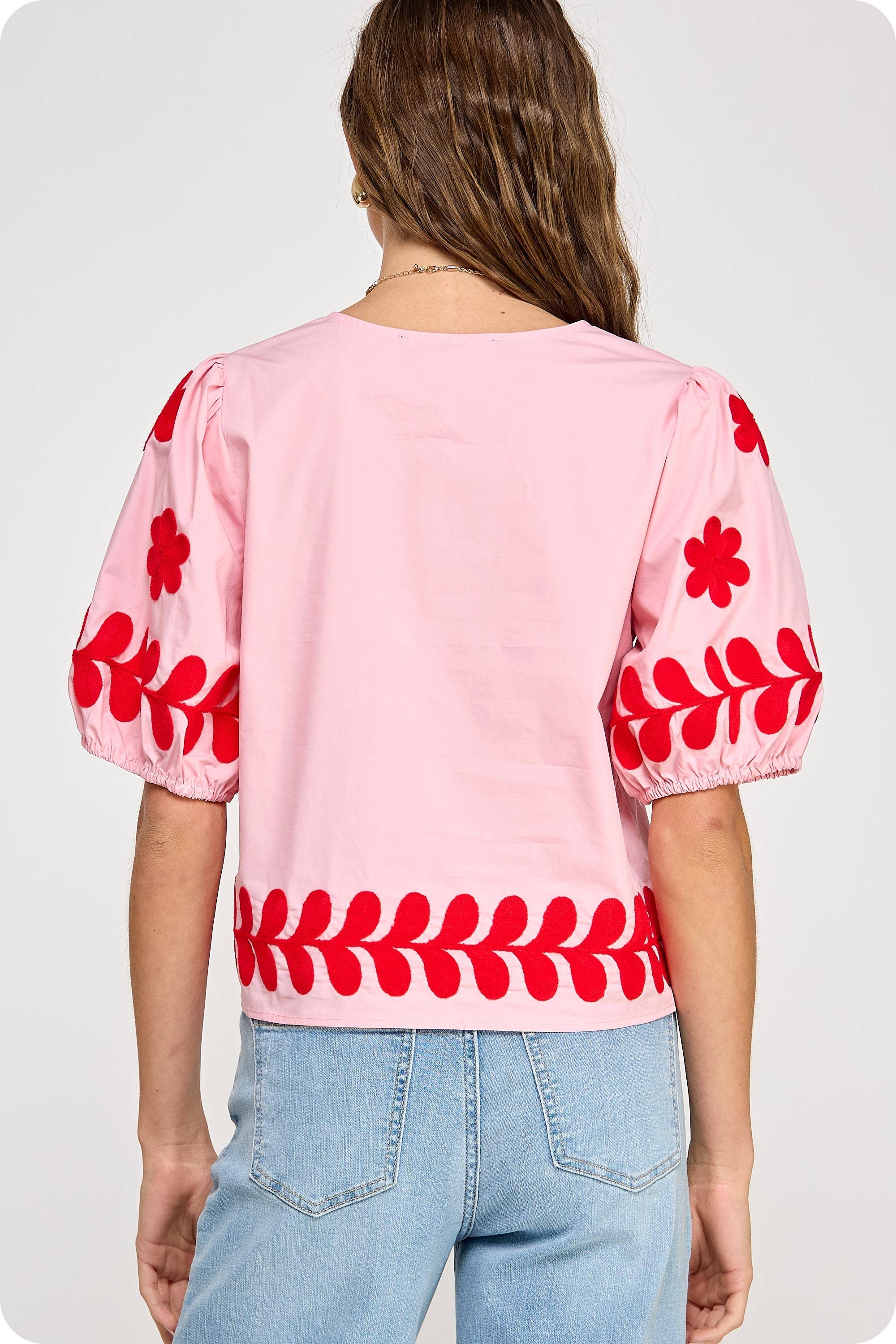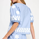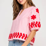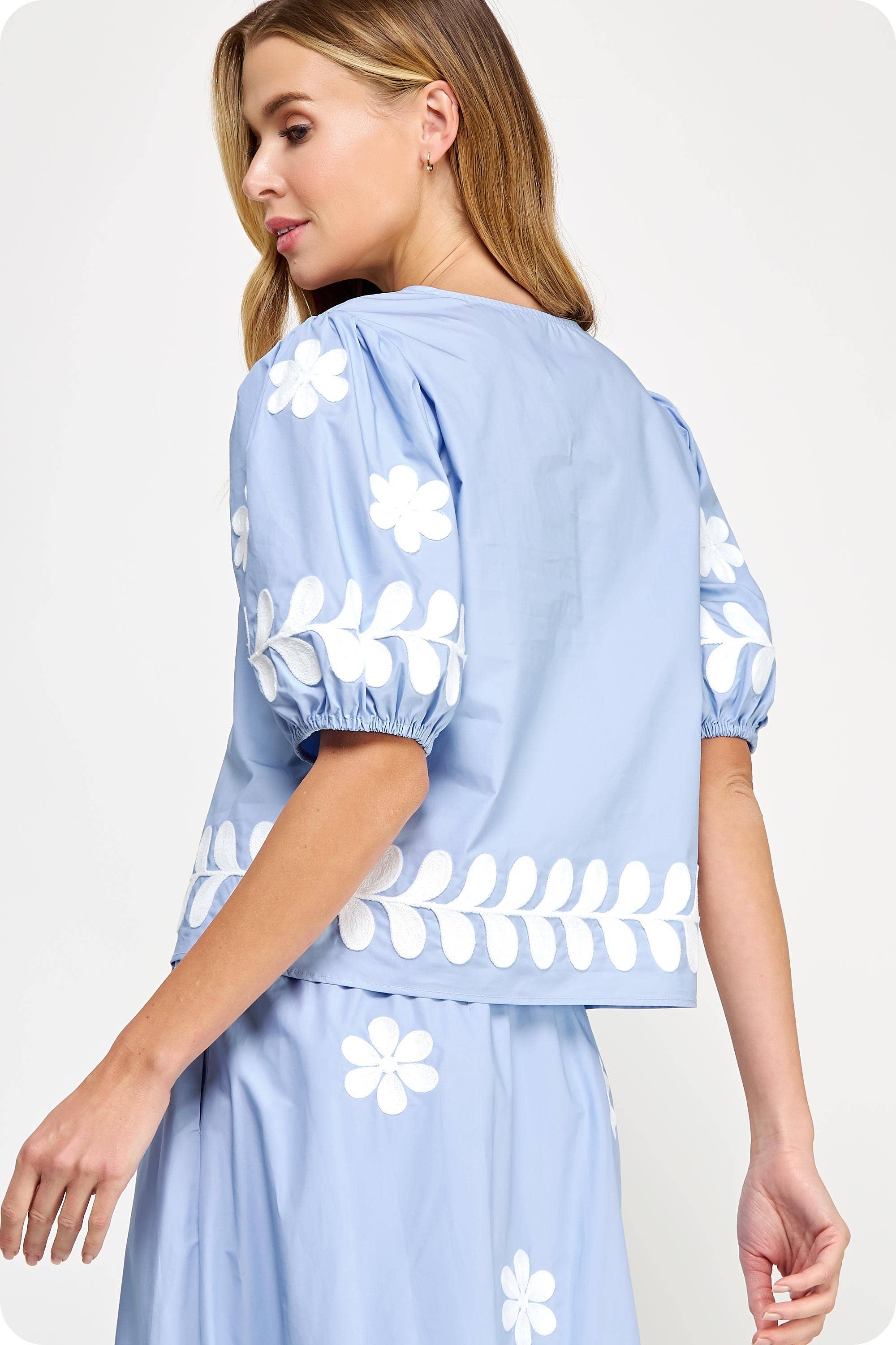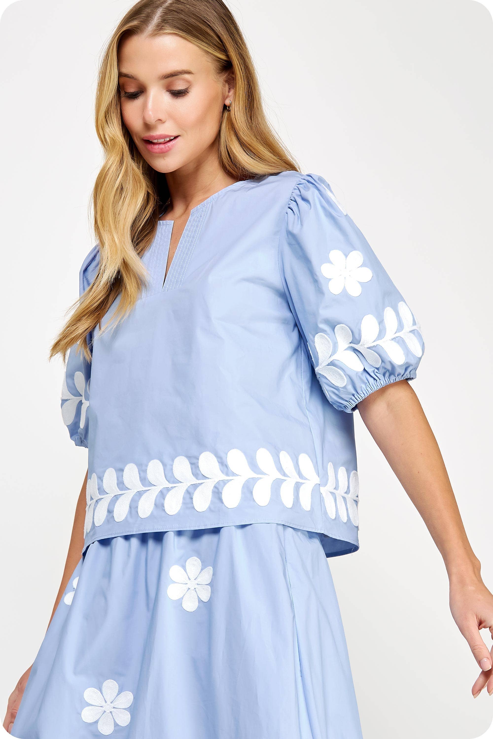 Floral embroidered blouse in cotton poplin fabric. This relaxed top features a split V neckline, short puff sleeves with elasticated cuff, statement floral embroidery throughout, and shirred shoulders. It can be made into a set with skirt S-8368-JK