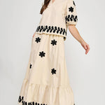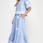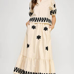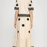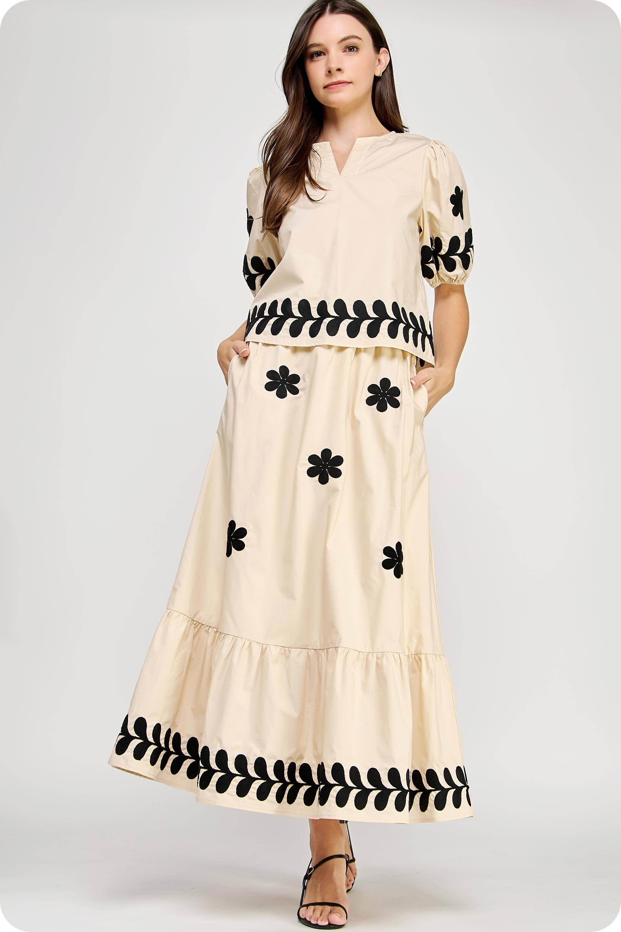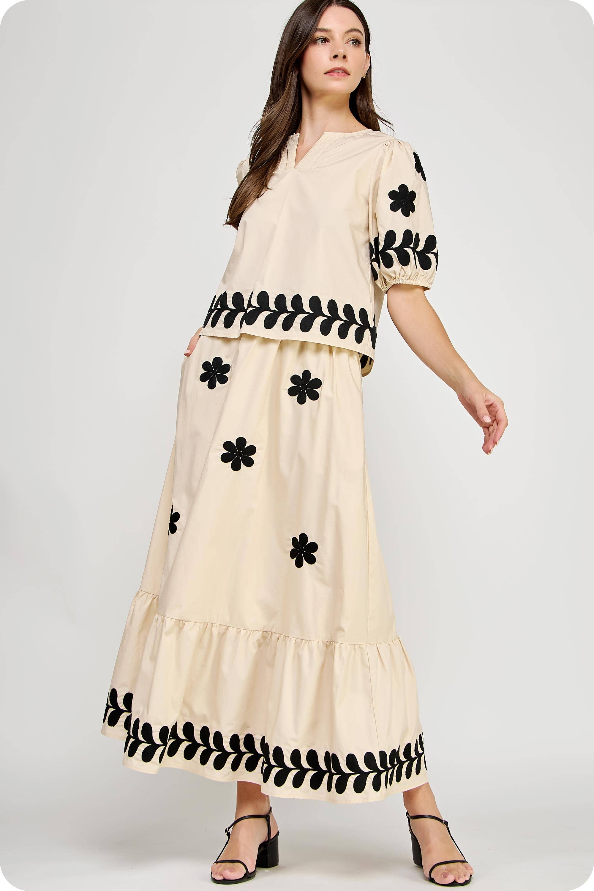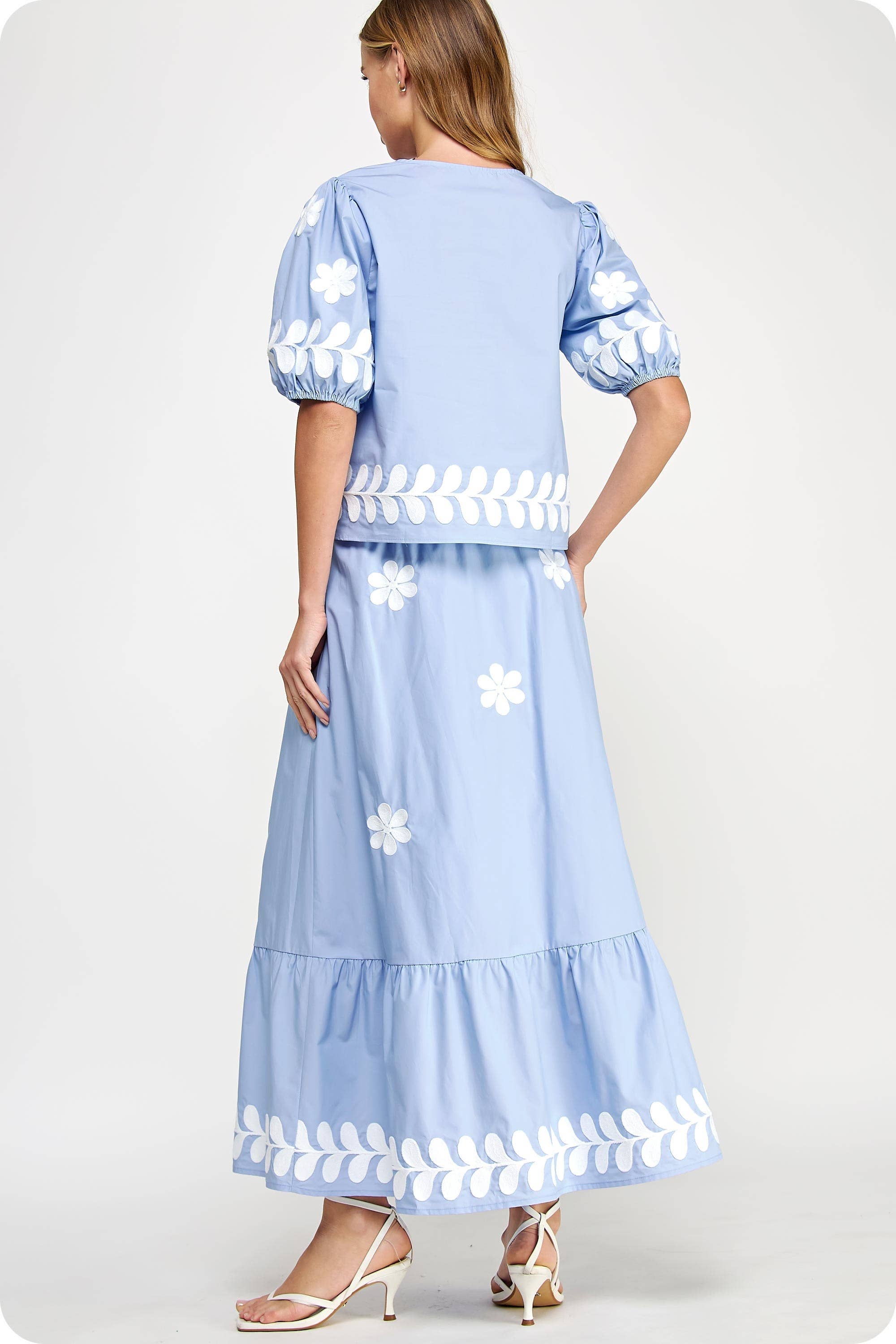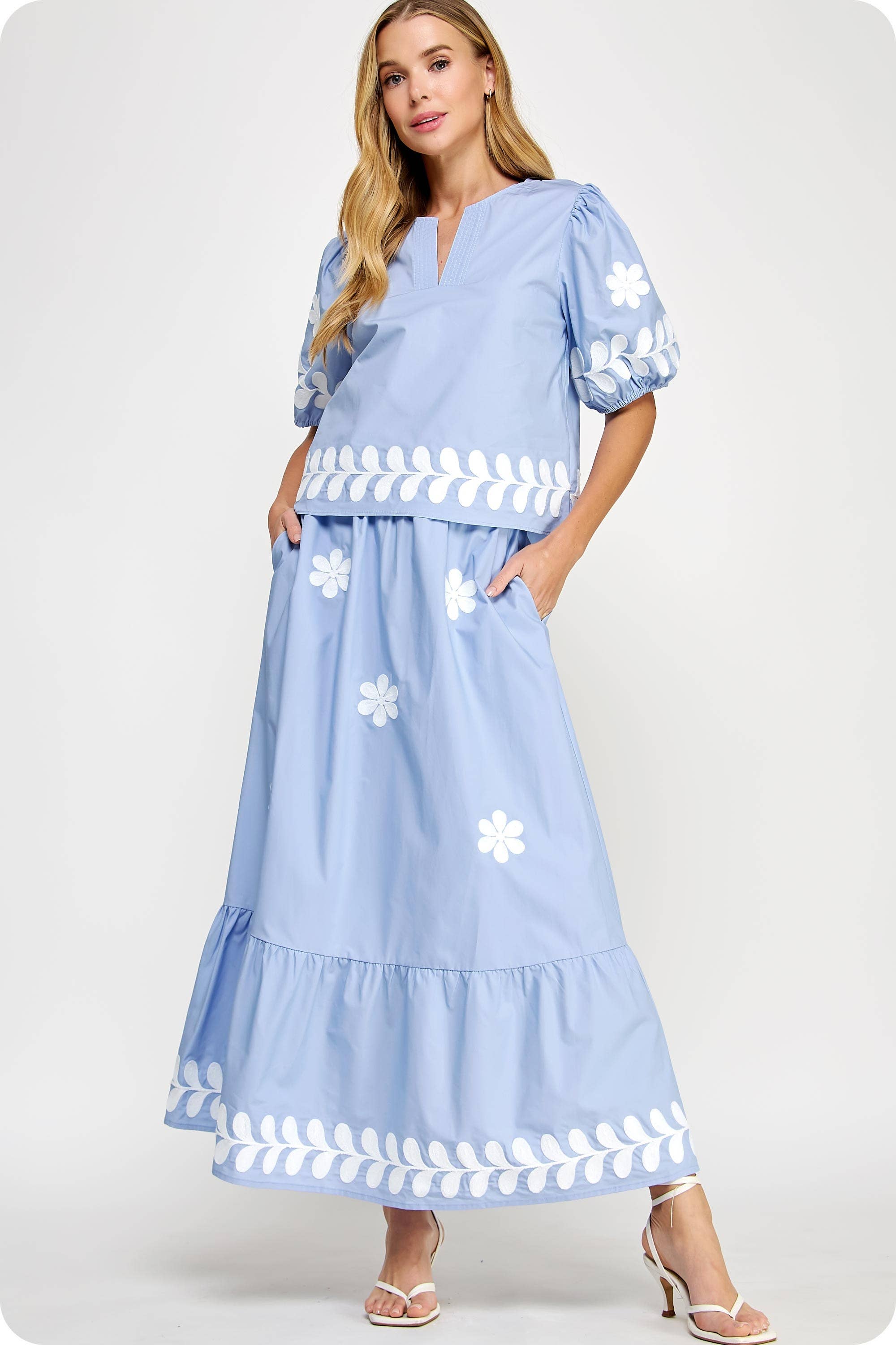 Floral embroidered blouse in cotton poplin fabric. This relaxed top features a split V neckline, short puff sleeves with elasticated cuff, statement floral embroidery throughout, and shirred shoulders. It can be made into a set with skirt S-8368-JK
