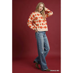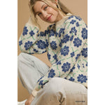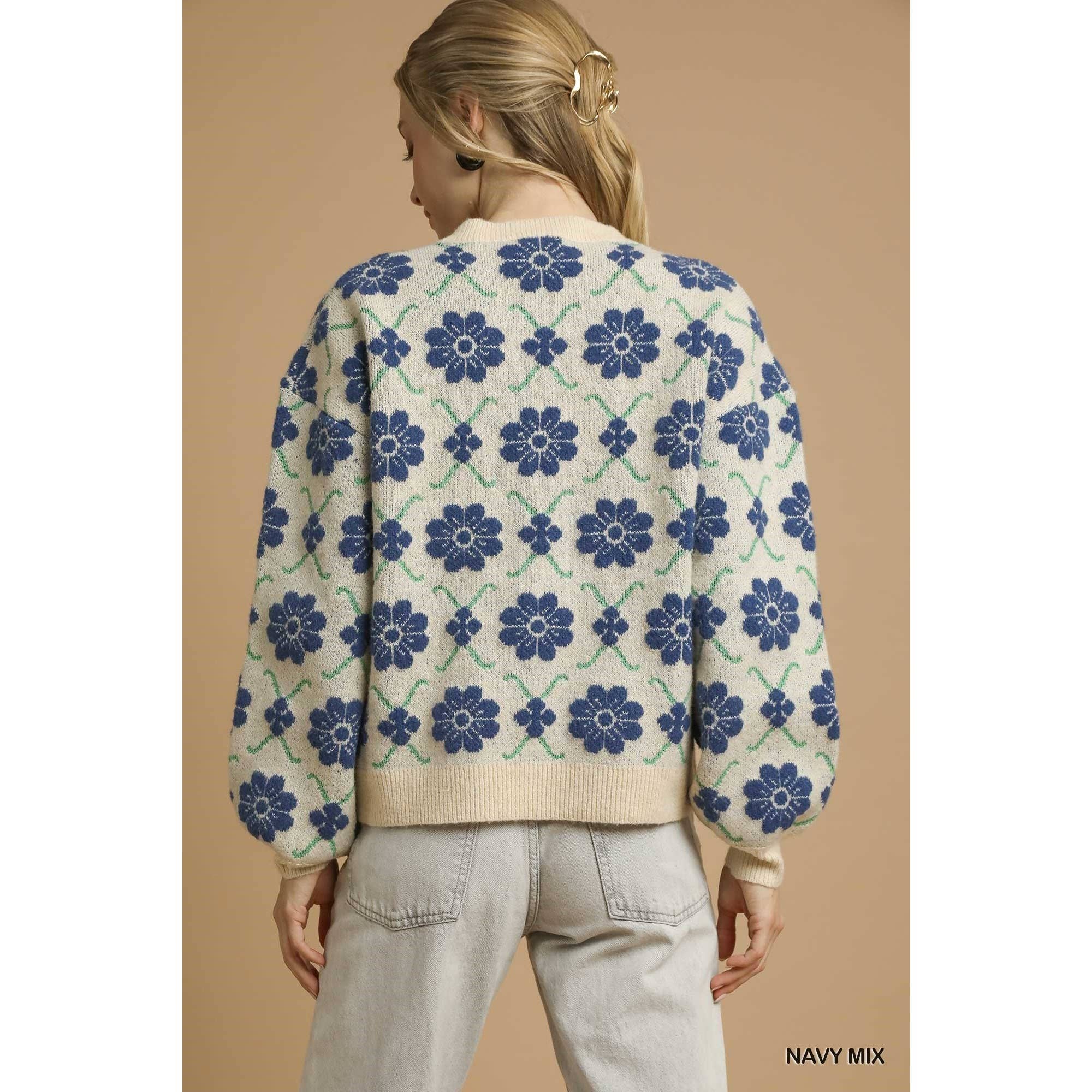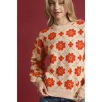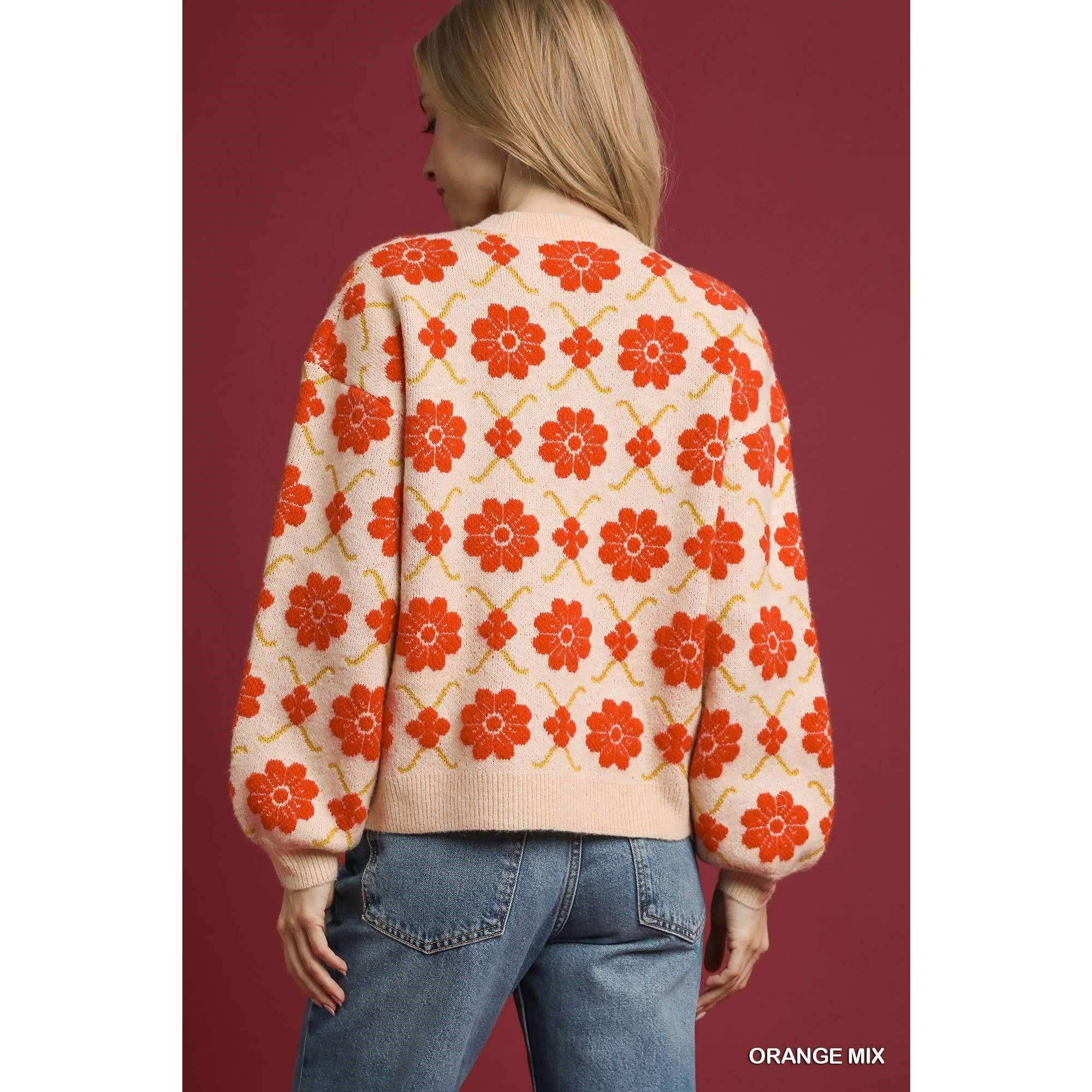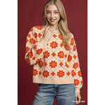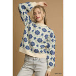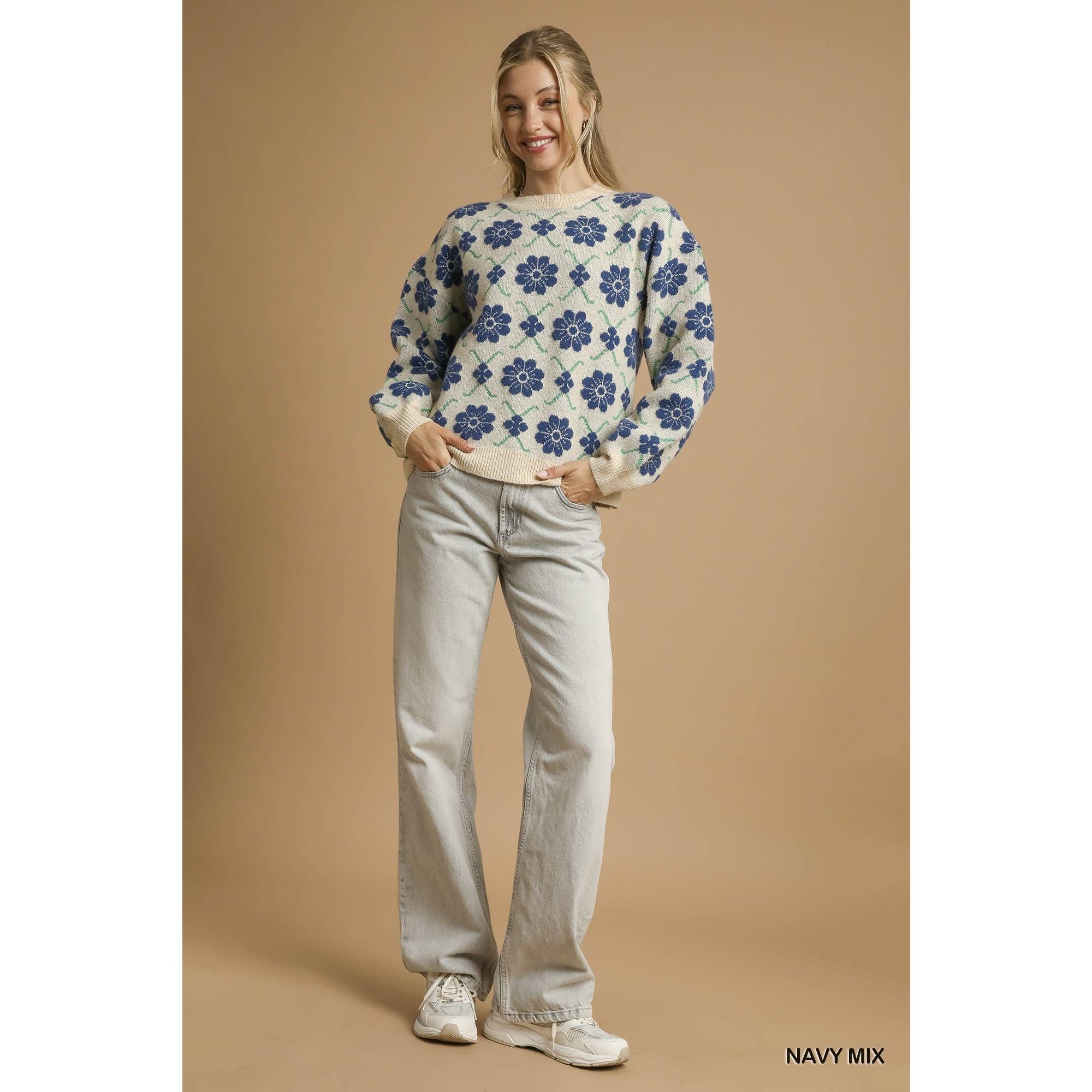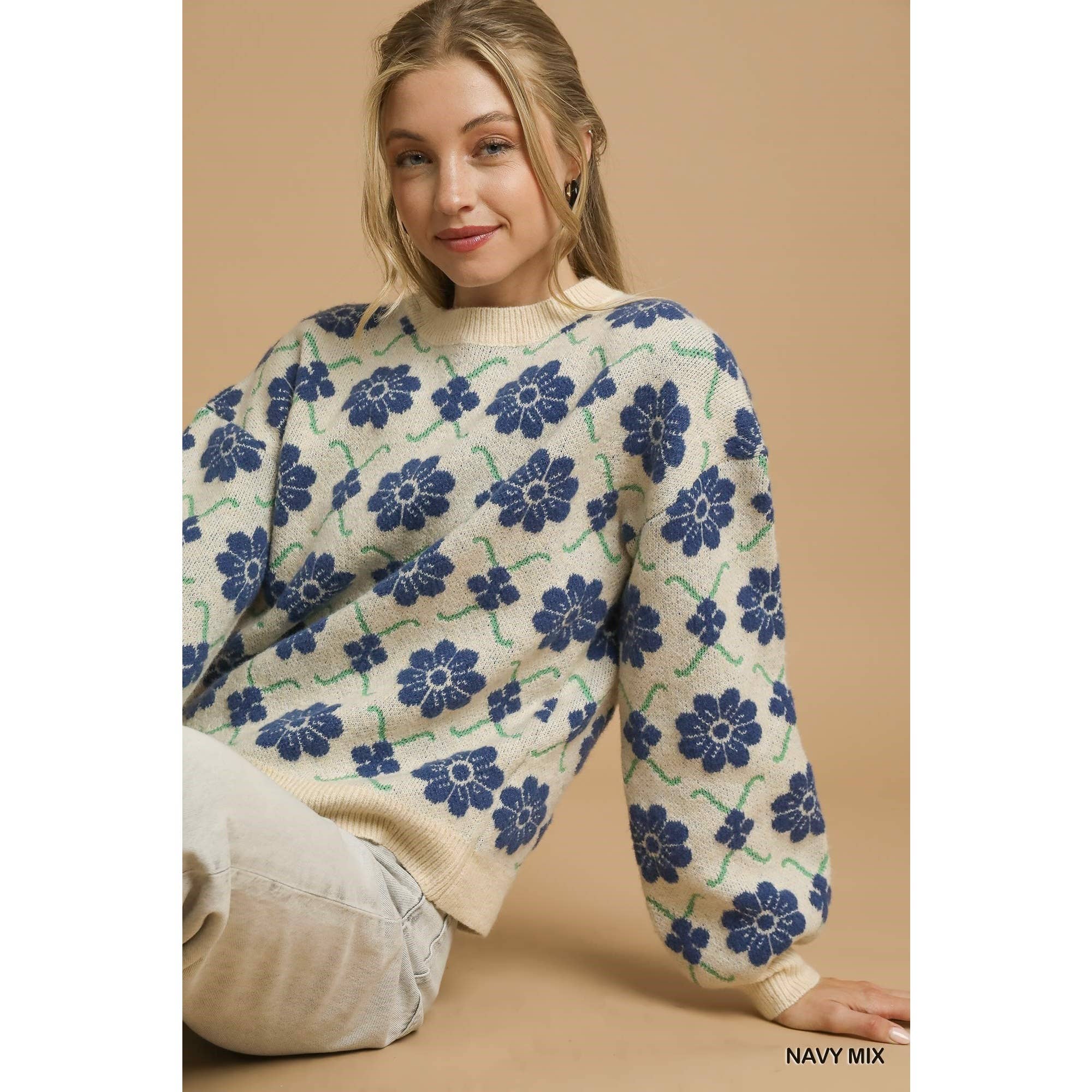 - Retro Floral Knit Sweater - Pullover sweater - Crew neck - Long sleeves with ribbed cuffs - Ribbed waistband - Relaxed and cozy - Not Lined - Model is 5'9" and is wearing a small. - 42% Acrylic. 30% Polyester . 28% Nylon