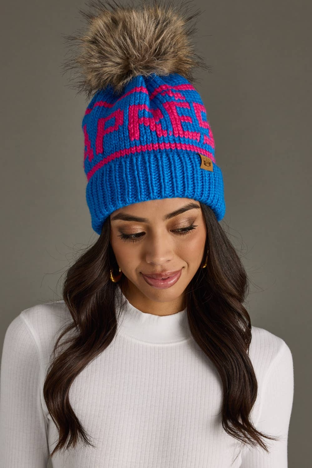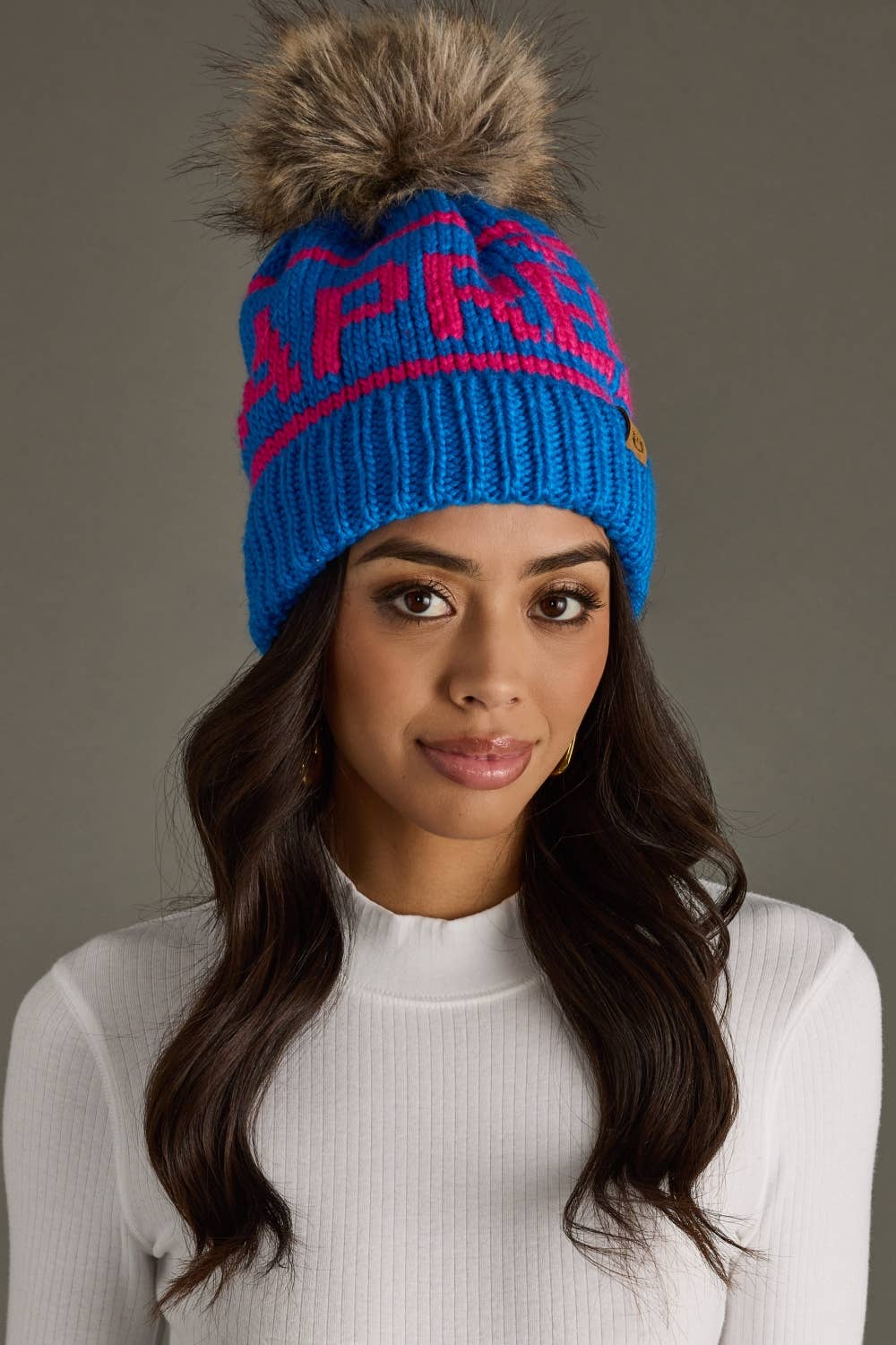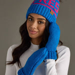 Blue & pink Apres knit hat Pairs with mittens M-349 Natural faux fur pom accent Fleece lined 100% Acrylic Min. Qty. 2