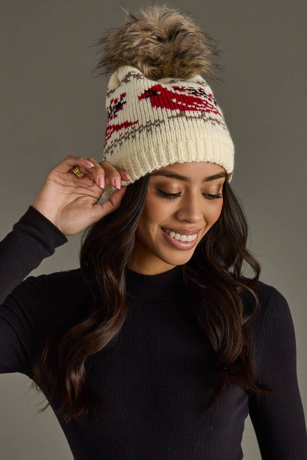 Ivory, red, black & taupe patterned pom hat Cardinal pattern Natural faux fur pom accent Fleece lined 100% Acrylic Min. Qty. 2