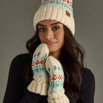 Ivory, lt. blue, mint & orange patterned pom hat Pairs w mittens M-441 Natural faux fur pom Fleece lined 100% Acrylic Min. Qty. 2