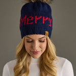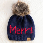 Navy knit pom hat Pairs with mittens M-327 Red "Merry" text Natural faux fur pom accent Fleece lined 100% Acrylic Min. Qty. 2