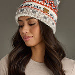 White, navy, orange, gray & taupe patterned hat Pairs w mittens M-401 Natural faux fur pom Fleece lined 100% Acrylic Min. Qty. 2