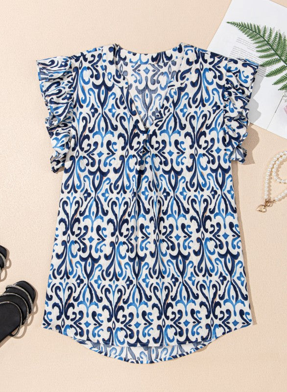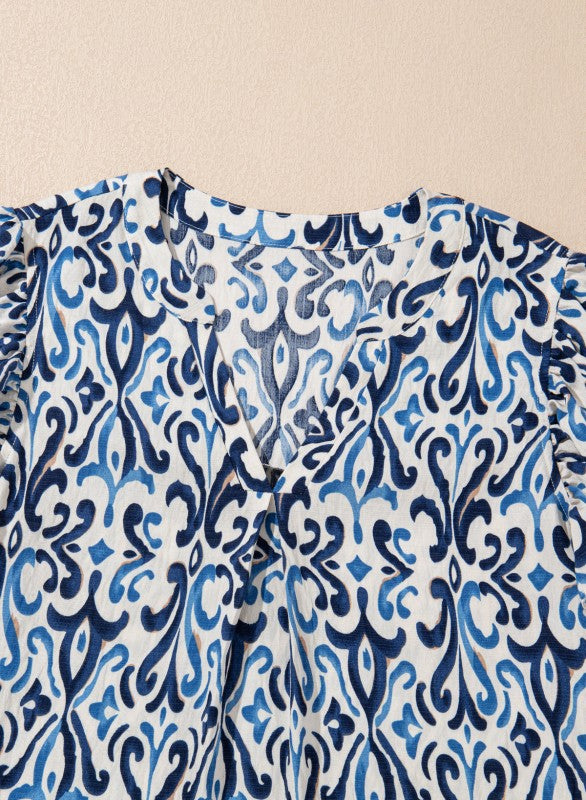 Abstract Boho V-Neck Pintuck Ruffle Sleeve Top