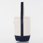 ote your favorite wines to your next family function in style with this pre-embroidered natural canvas two bottle Wine Tote with contrast navy trim. Perfect for any BYOB event or a great housewarming gift
