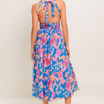 A printed woven midi dress featuring halter neckline, lace inset detail, full skirt, bare back with tie and smocked back waistband