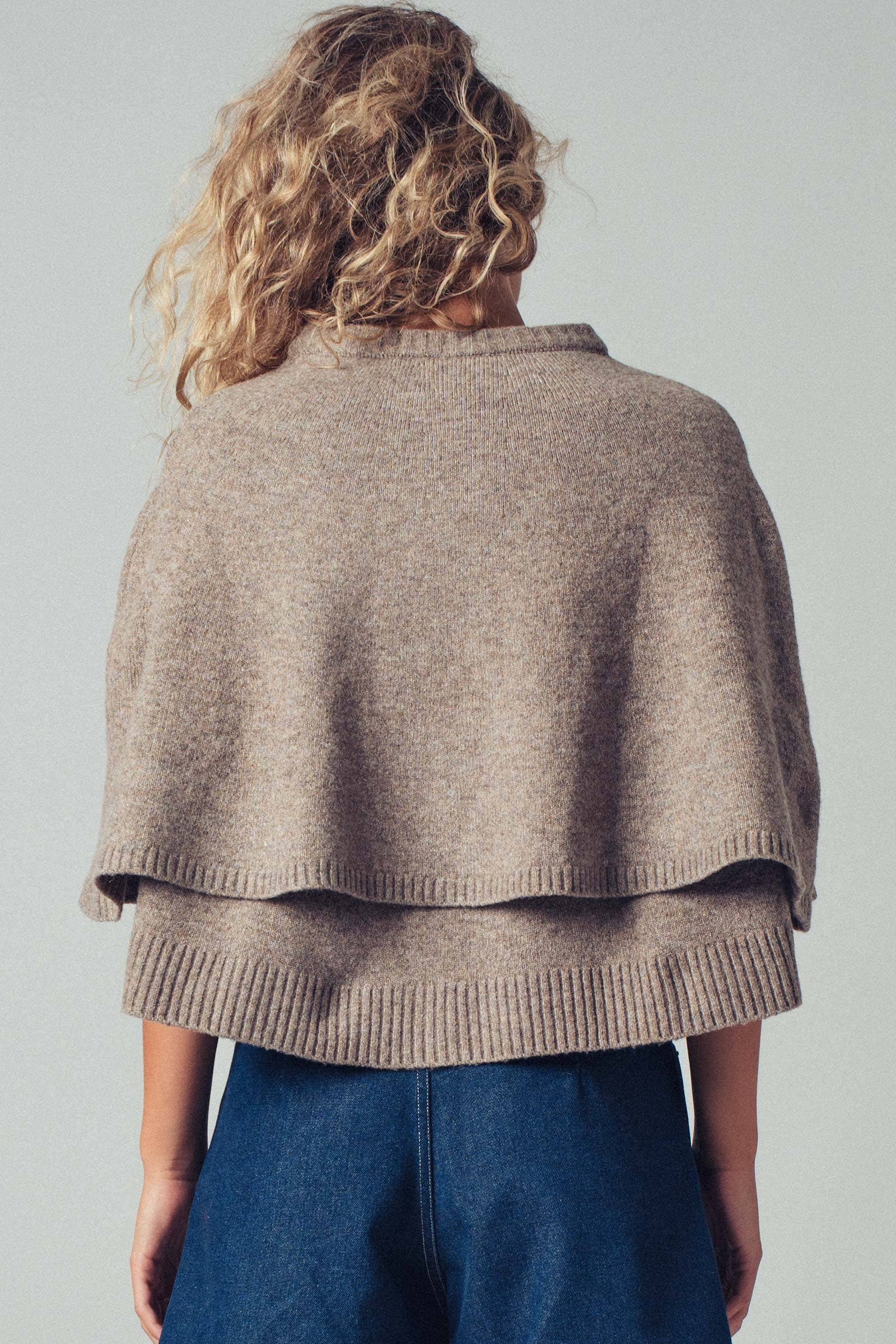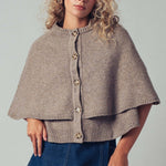 This cozy sweater cape offers effortless style and warmth, perfect for layering on cool days. The button-front closure and soft wool blend create a luxe drape, while generous arm openings make it easy to wear over dresses or tops.